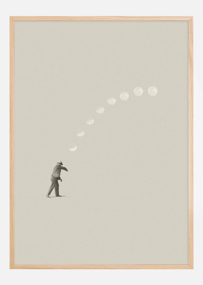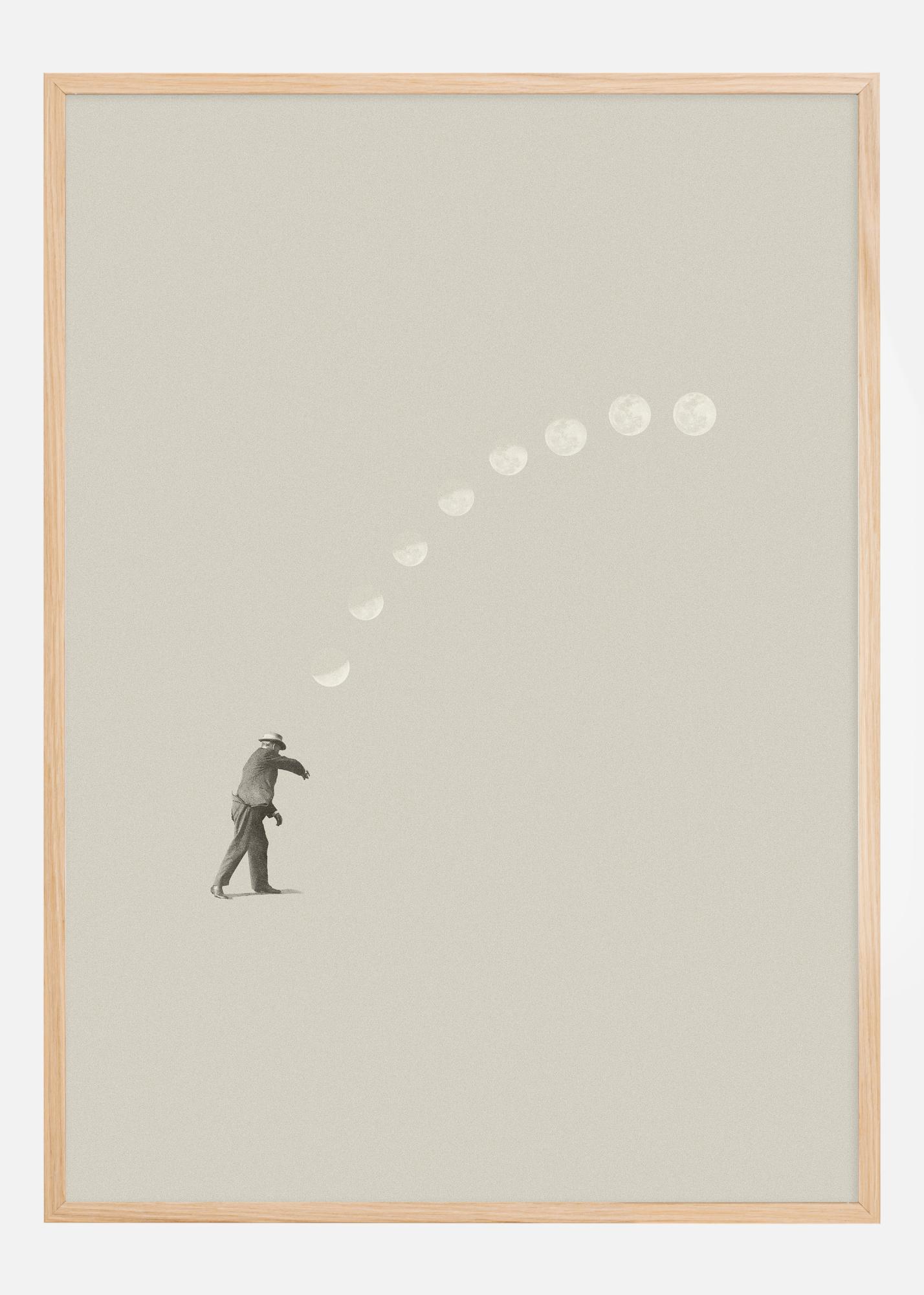 Този поетичен плакат представя силует на мъж, който с мощно движение хвърля луна към небето. Това е сцена, която улавя момента на изстрелването на луна, образуваща орбита от различни лунни фази. Тази постъпка може би символизира мечти и амбиции, насочени към безкрайни възможности. Минимализмът на изображението засилва мощния жест и оставя пространство за зрителя да добави своя собствена история и значение.