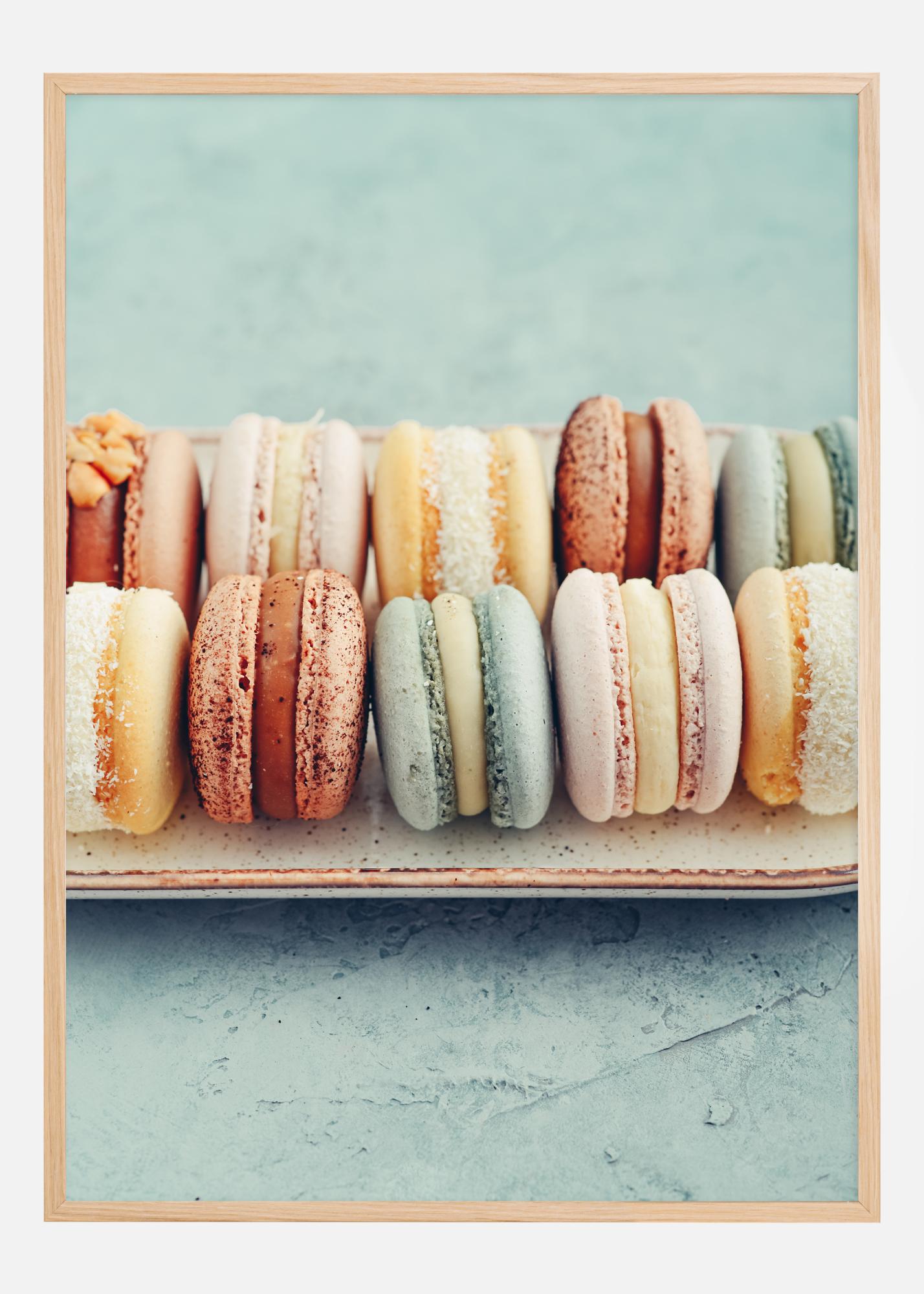 Този цветен и апетитен плакат изобразява редица деликатно подредени макарони, чиито разнообразни цветове и текстури създават визуален празник. Меките пастелни цветове варират от бледо лимонено до наситено карамелено и пудрено розово, всеки макарон е акцентиран с детайли като захарни пръчици и кокосови стърготини, които подчертават външния му вид и предполагаем вкус.