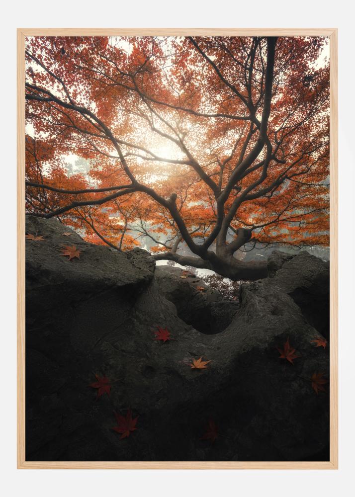 Една зашеметяваща природна постер с красиво, оранжево кленово дърво. Заснета от жабешка перспектива, силната слънчева светлина сияе през клоните и създава топло и отпускащо усещане. На преден план няколко червени и оранжеви листа са паднали върху стъбло. Добавете нотка природа с този печат в дома си.