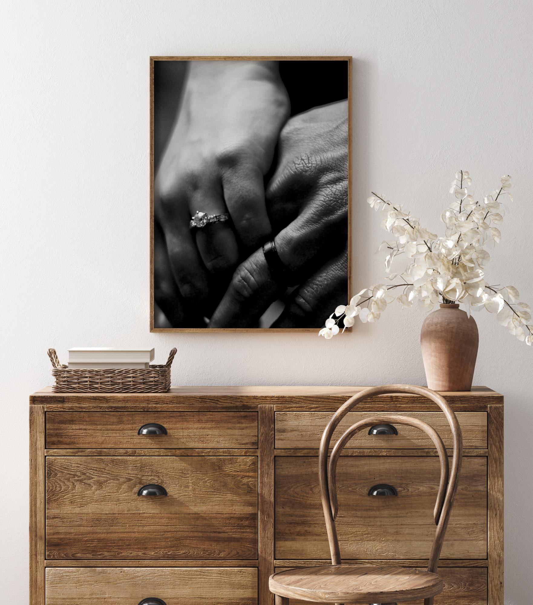 Романтичен черно-бял принт на две ръце, които носят пръстени. Силно и емоционално изображение на тъмен фон. Естествената светлина осветява малкия пръстен, приличащ на диамант. Романтичен постер, който да закачите на стена в спалнята.
