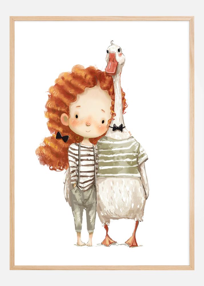 Този игрив и сърдечен плакат изобразява младо момиче с живи, червени къдрици, стоящо до нейния верен спътник, голяма патица. Те споделят нежен и радостен момент заедно, уловен в меките, топли тонове на акварелната картина. Очарователното дуо, с розовите бузи на момичето и любопитния поглед на патицата, излъчва приятелство и радост.