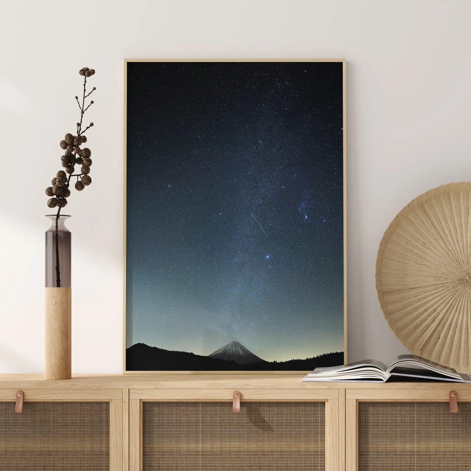Красива постер с нощно небе и метеор. Със заснежена планина, която се вижда в далечината, има мистично усещане за магическите бели звезди. Лъч естествена светлина грее зад планината и създава магическото и мистично усещане. Перфектен за детска стая.