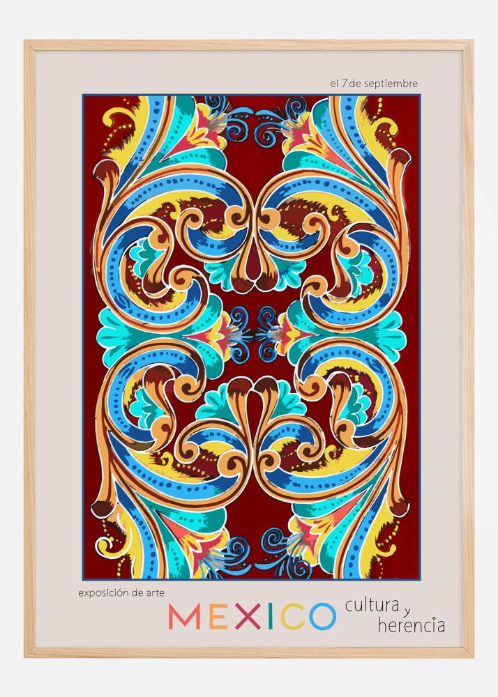 Този жив и цветен плакат празнува художествена изложба в Мексико. Неговият дизайн е вдъхновен от традиционни мексикански модели, пълен с вълнообразни криви и буйни цветни мотиви, които канят окото да танцува върху изображението. Богатите червени, жълти и сини цветове са типични за мексиканското народно изкуство и символизират културата и наследството на нацията с модерен обрат.