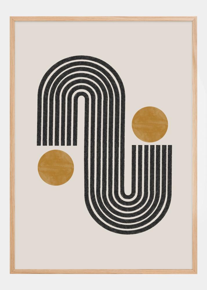 Открийте свят на стилна красота с нашия постер, който подчертава контрастите чрез форма и цвят. Тази принтирана картина показва динамичен черно-бял модел от линии, които образуват меко извита форма, балансирана с две кръгове в охра, които придават топло и земно усещане. Тази минималистична, но ефективна дизайнерска концепция е вдъхновена от естетиката на средата на века и предлага усещане за спокойствие и баланс във всяко пространство, в което се намира.