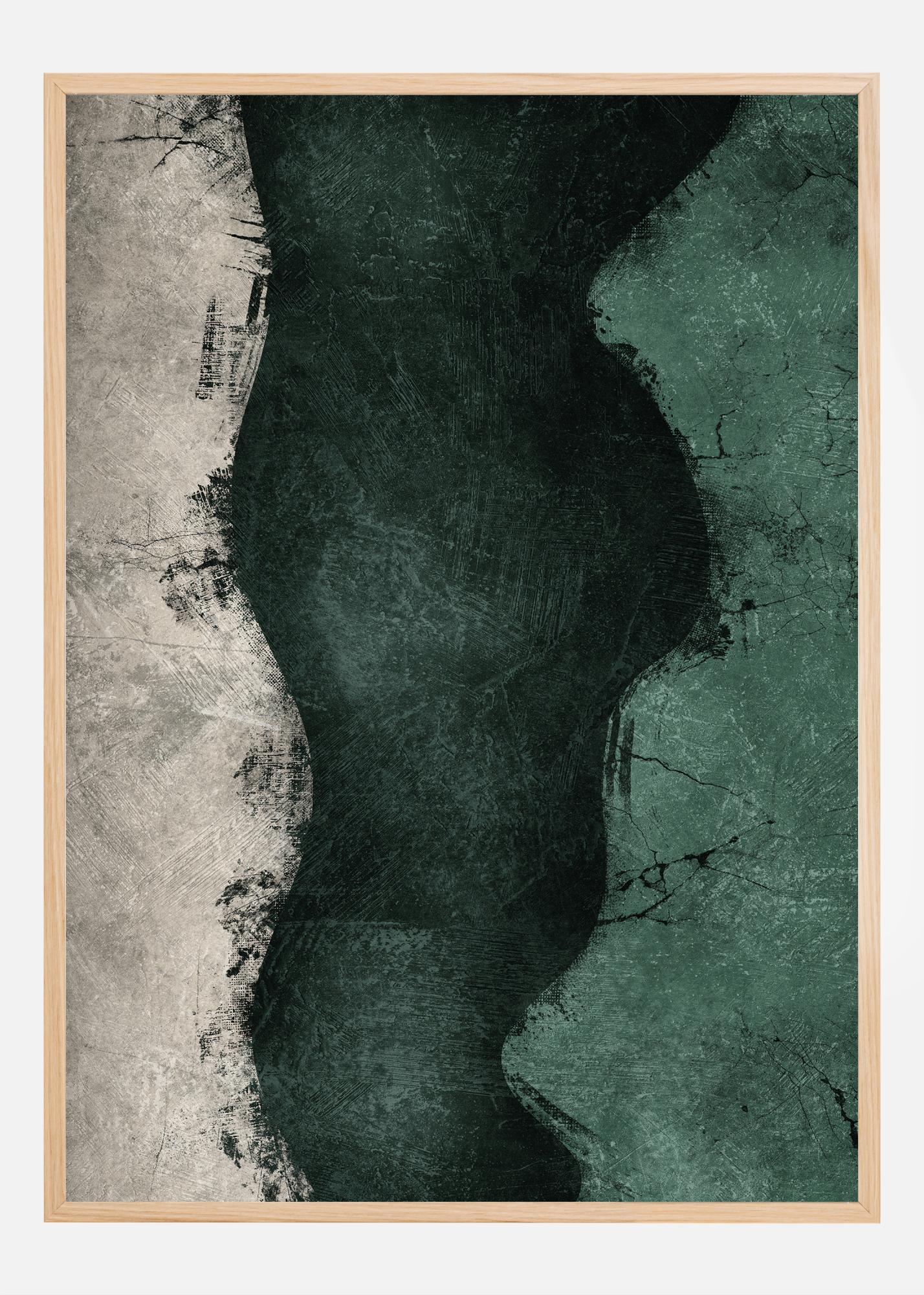 Този плакат създава силен визуален ефект с разделената си композиция от текстурирани форми, наподобяваща въздушна снимка на тъмен пейзаж или пропаст между два свята. Едната страна показва интензивно зелен тон с дълбоки текстури, а другата - по-блед контрастиращ нюанс, които заедно създават усещане за динамичния контраст на природата между гората и откритото пространство. Това е драматично и завладяващо изображение, което играе със сенки и светлина, създавайки усещане за мистерия и увлечение.