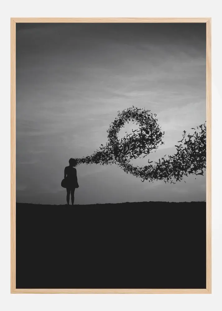 Напълно креативен постер с жена, чиято глава се разпада. В тъмния постер прилепите образуват кръгови въртежи, докато се отдалечават. С тъмното облачно небе, черно-белият плакат ще придаде магическо усещане на вашия дом.