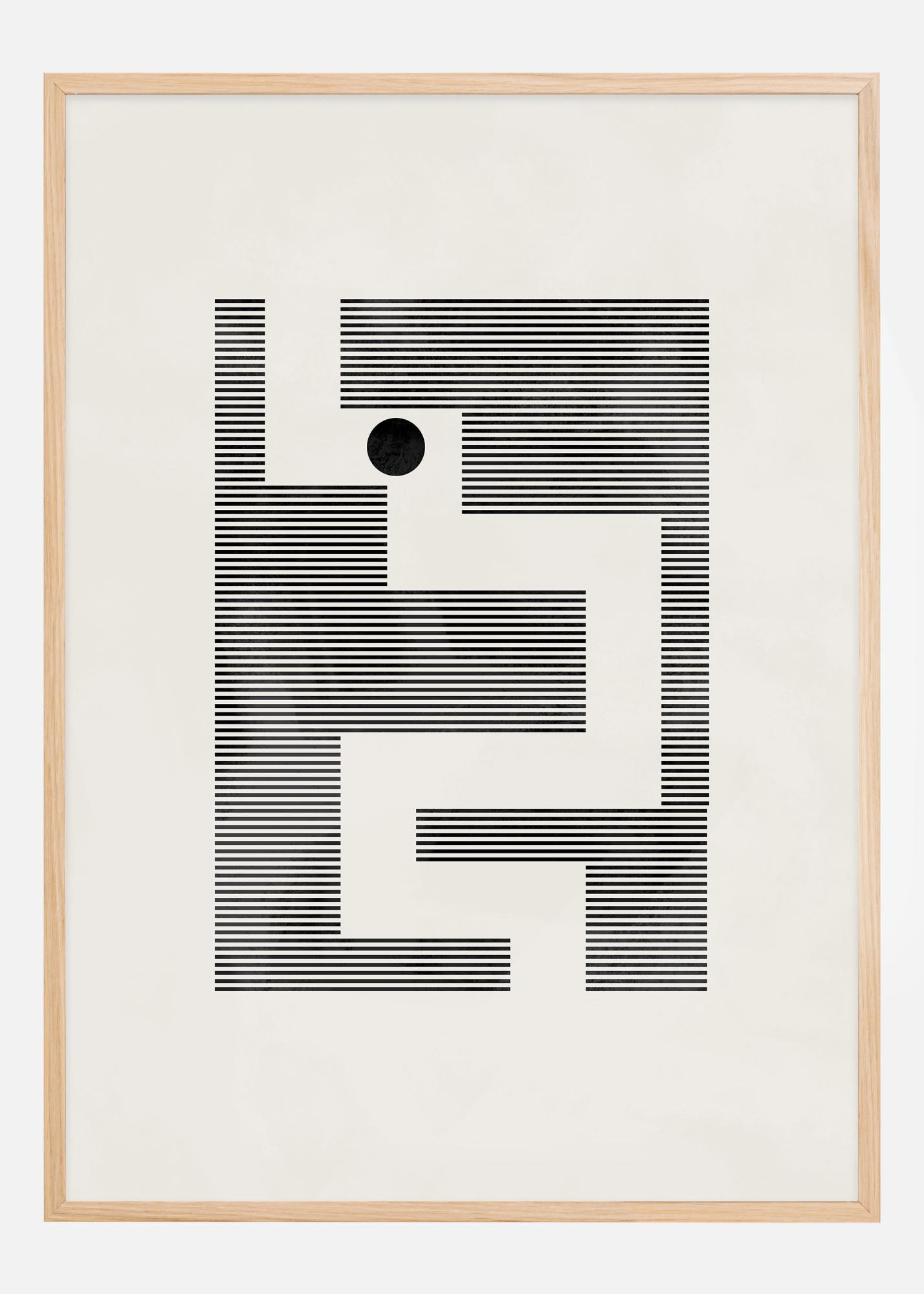 Този артистичен постер предлага минималистична интерпретация на лабиринт, изпълнена с черни линии, които създават сложна тъкан от геометрични форми върху кремав фон. Самотният черен кръг, разположен в центъра на лабиринта, служи като визуална котва, като същевременно придава дълбочина и фокус на иначе простия мотив. Този дизайн играе с окото на зрителя и насърчава визуално изследване на неговите пътища и задънени улици.