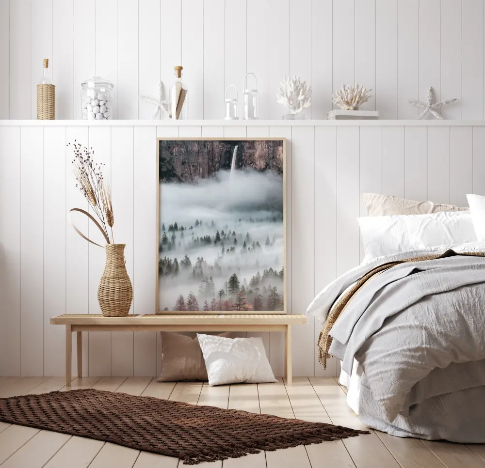Една прекрасна фотография на мъглив планински склон с няколко камъка и впечатляващ водопад на заден план. Облачната мъгла се носи спокойно и създава усещане за свежа утрин, която украсява вашия дом. Прекрасните есенни цветове и носещата се мъгла създават усещане за мистикa.