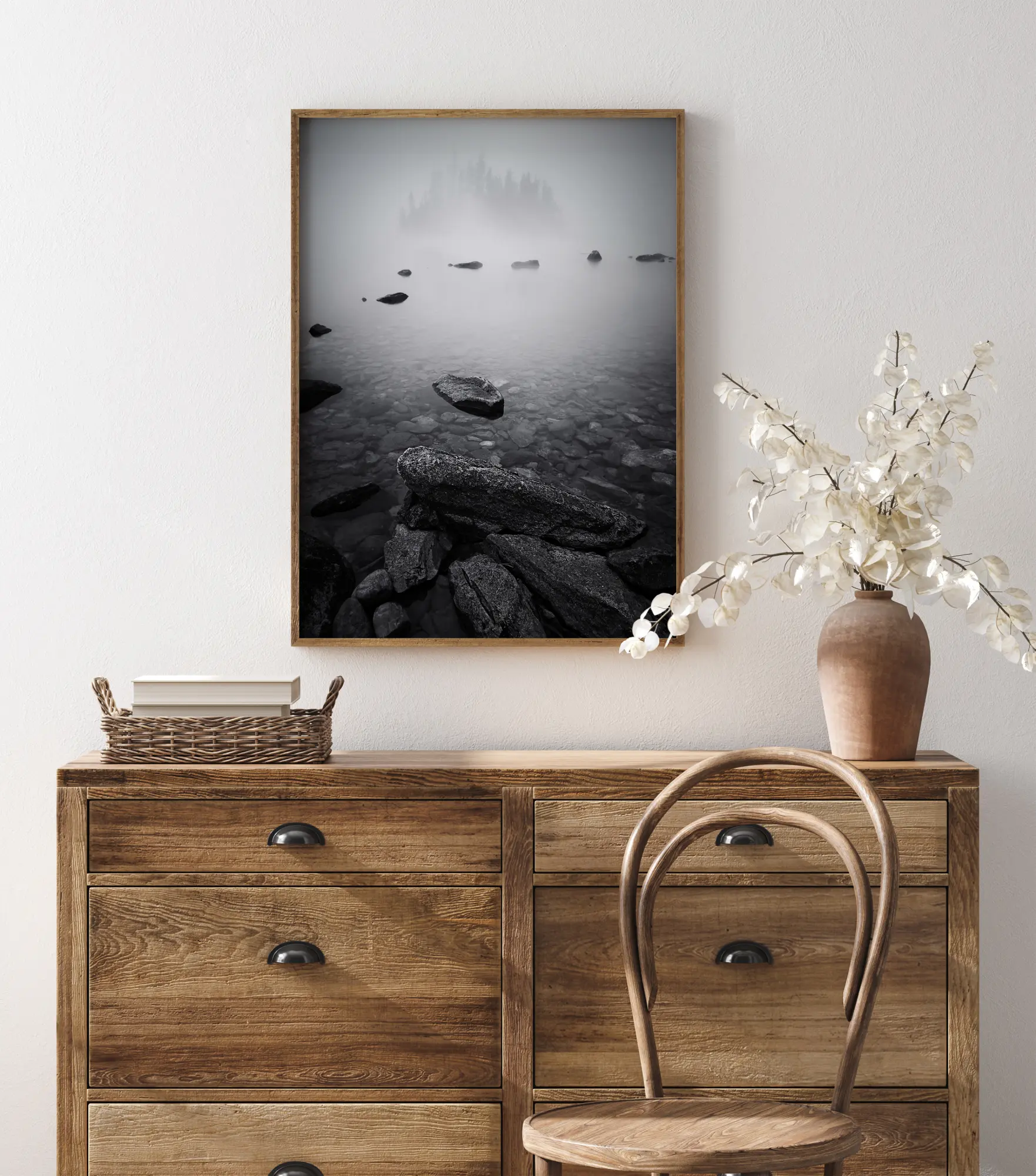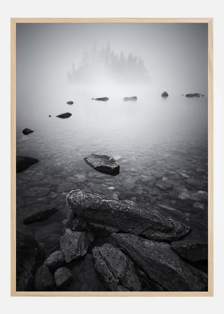 Мистериозен природен постер с камъни и мъгливо езеро. Представи си какво има там, когато поглеждаш към мъгливия остров, покрит с дървета. Направи дома си магичен с този невероятен принт на синя стена.
