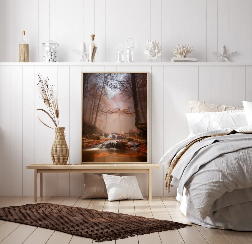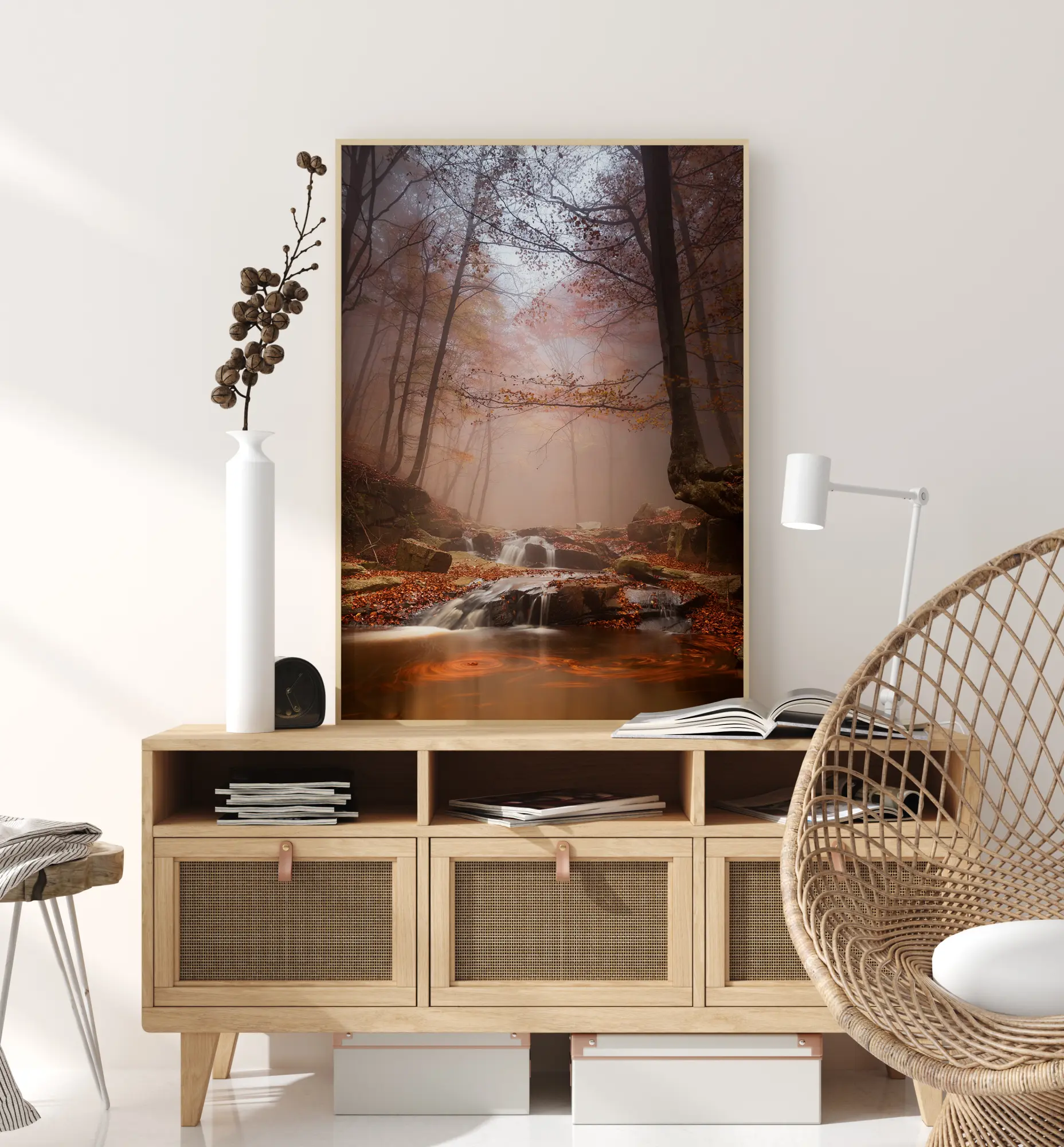 Един пленителен пейзаж на мъглива гора с красива рекичка. Мъглата блокира директната слънчева светлина и само някои лъчи осветяват мъгливата гора, подчертавайки кафявите и жълти листа. На преден план лежат есенни цветни листа на брега на реката. Този плакат е готов да придаде на дома ви живописна и камениста горска гледка.