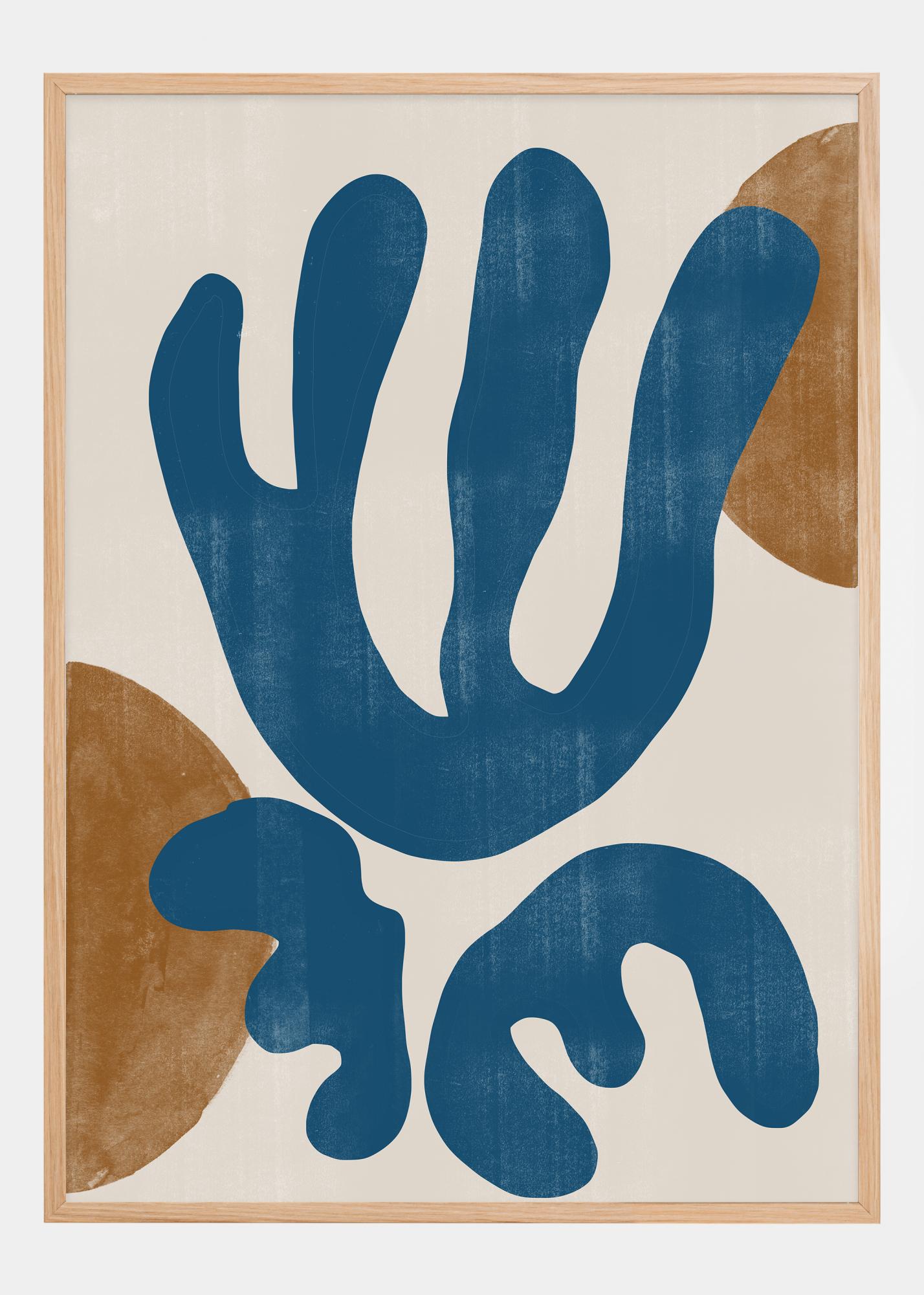 Този живописен постер съчетава смели форми и земна цветова палитра, за да създаде усещане за съвременно изкуство и чудесата на природата. Големите, плавни сини форми събуждат асоциации с вода или растителност, докато охровите детайли добавят топъл и естествен контраст. Този дизайн е отличен пример за това как абстрактното изкуство може да наподобява и отдава почит на органичните шарки в нашия свят.