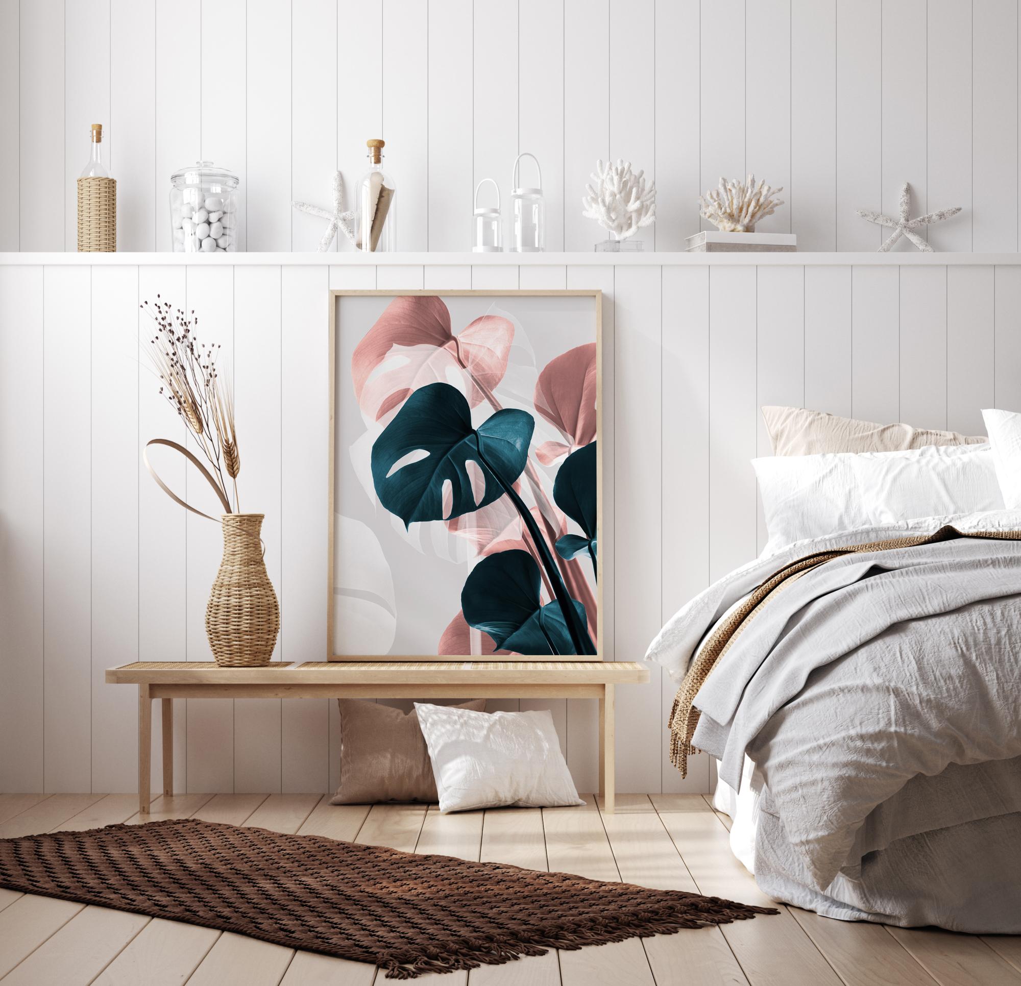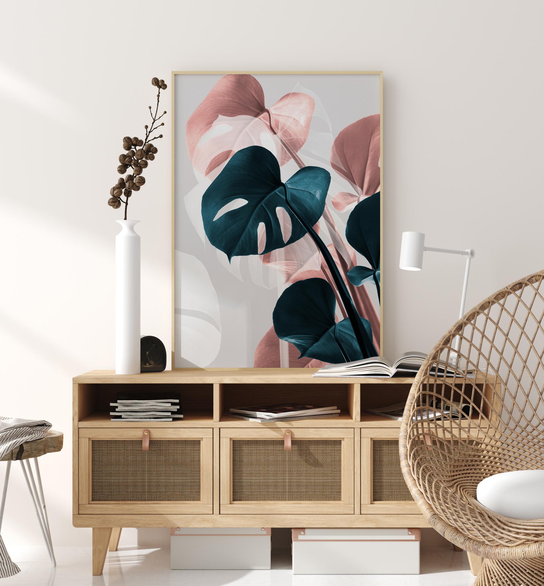 Красива постер с розови и тъмнозелени листа от монстера, която показва перфектното творчество в листата. На бежов фон сърцевидните листа светят с красивите си зелени и розови листа. Листообразните мотиви носят вълнуващо усещане в дома ви.