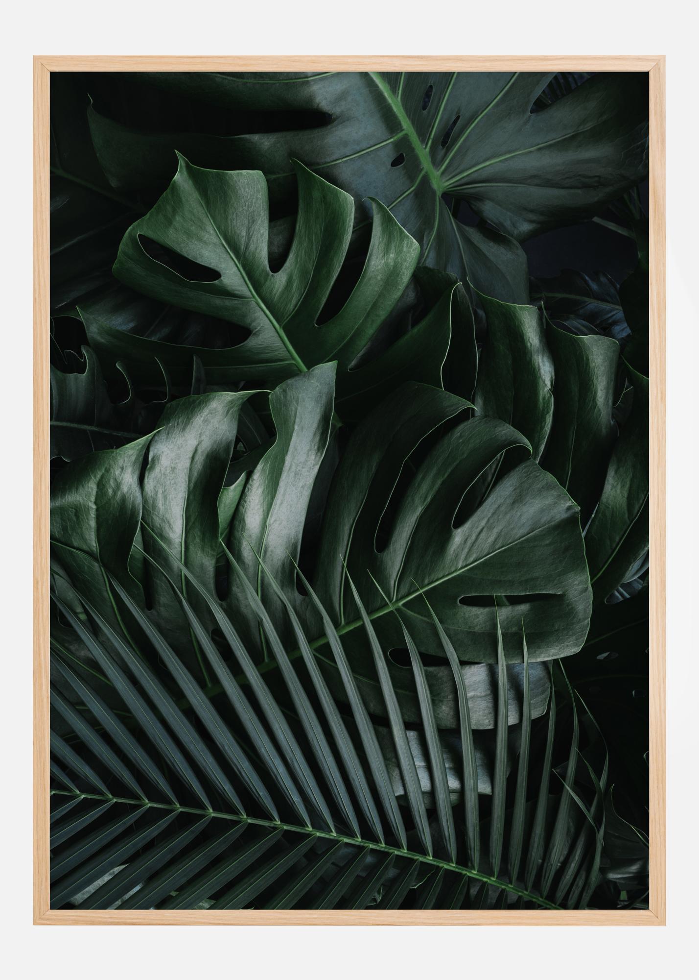 Един листен портрет на зелени Monstera и палмови листа. Естествената светлина свети върху горните листа на монстера и създава по-тъмни нюанси в горната част на отпечатъка. Завързаните листа създават топло, релаксиращо усещане. Перфектен плакат за всички, които обичат растенията.