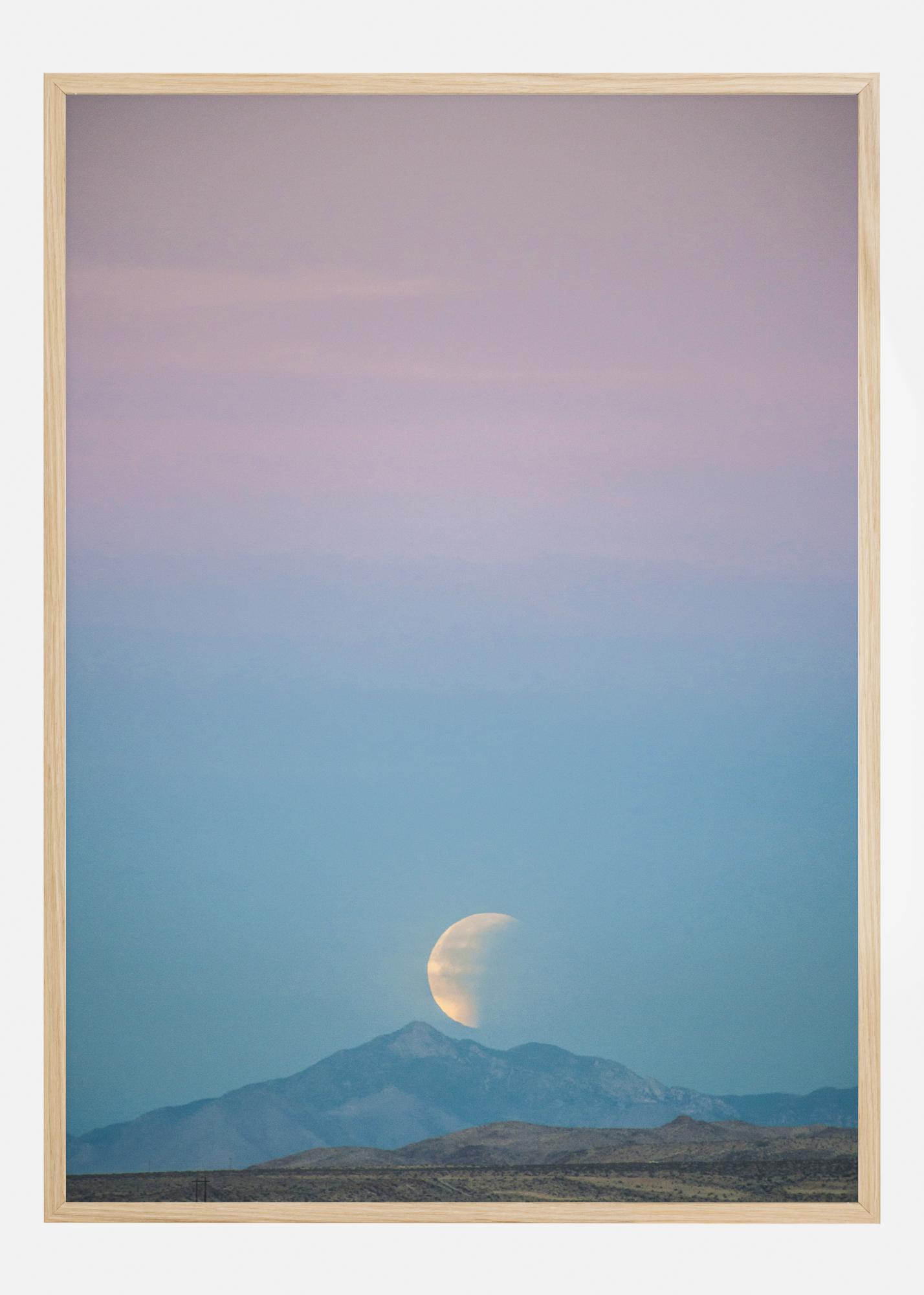 Плакат с природен мотив на луна върху върха на планина. Небето преминава от зеления цвят на заден план към розовия цвят на преден план. Електрически стълбове се виждат в хълмистия преден план. Донесете красотата на чудните гледки на майката природа в дома си.