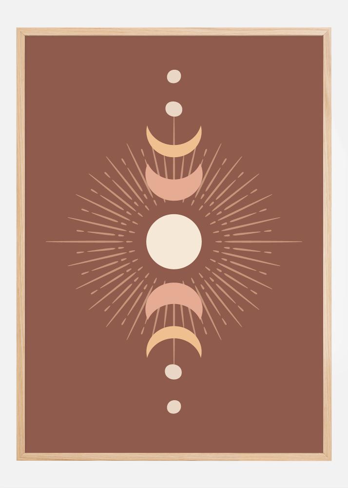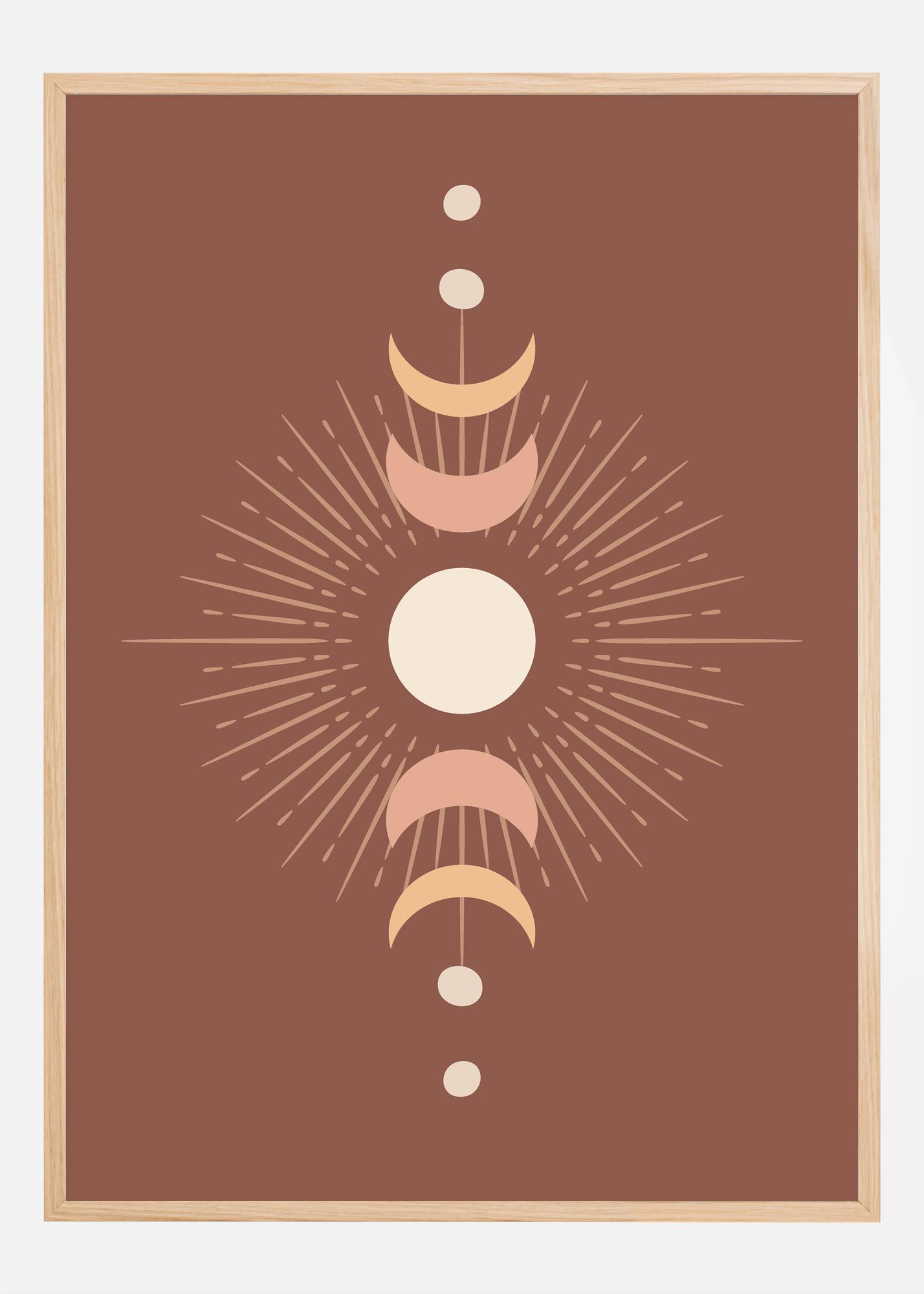 Този стилен плакат, който изобразява различните фази на луната срещу дълбок и замислящ фон, създава усещане за космическа хармония и вечна красота. Внимателно очертаните лунни фази, централно разположени с блестящото слънце под тях, са напомняне за нашето място във възвишения контекст на Вселената. Неговата топла цветова гама в земни тонове създава успокояваща и гостоприемна атмосфера.