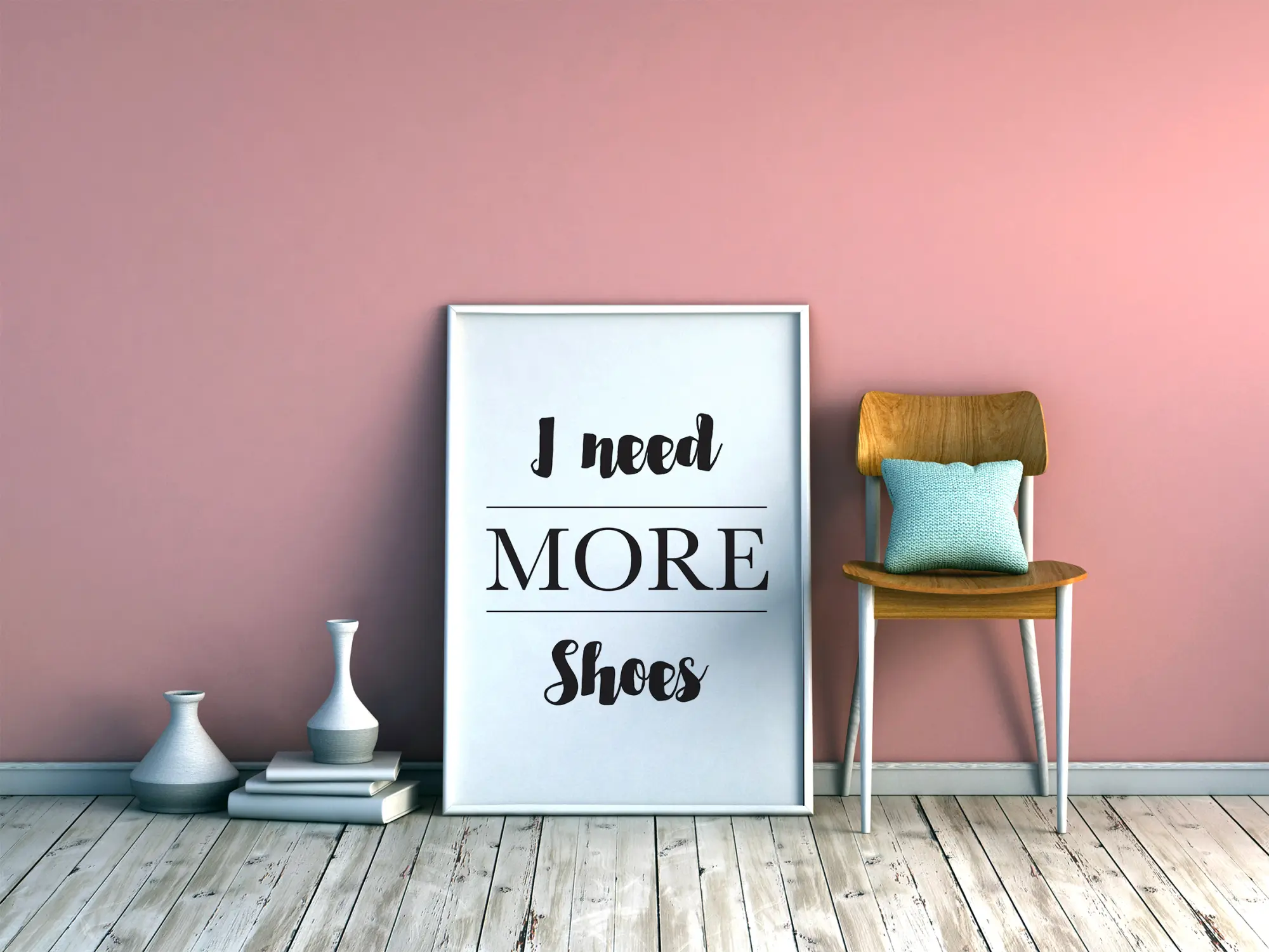 Ако сте горд шопахолик, фокусиран върху обувки, тук имаме постер, който е идеален за вас! Очарователният мотив е черен и се състои от текста "Имам нужда от повече обувки", отпечатан в 2 различни шрифта. В средата са разположени две декоративни черни линии. Стилният и изчистен дизайн пасва перфектно с черна или бяла рамка. Ако искате да го направите още по-личен, изберете рамка в любимия си цвят. Постерът се предлага в няколко различни размера, така че лесно ще намерите такъв, който пасва на вашето бюро или стена.