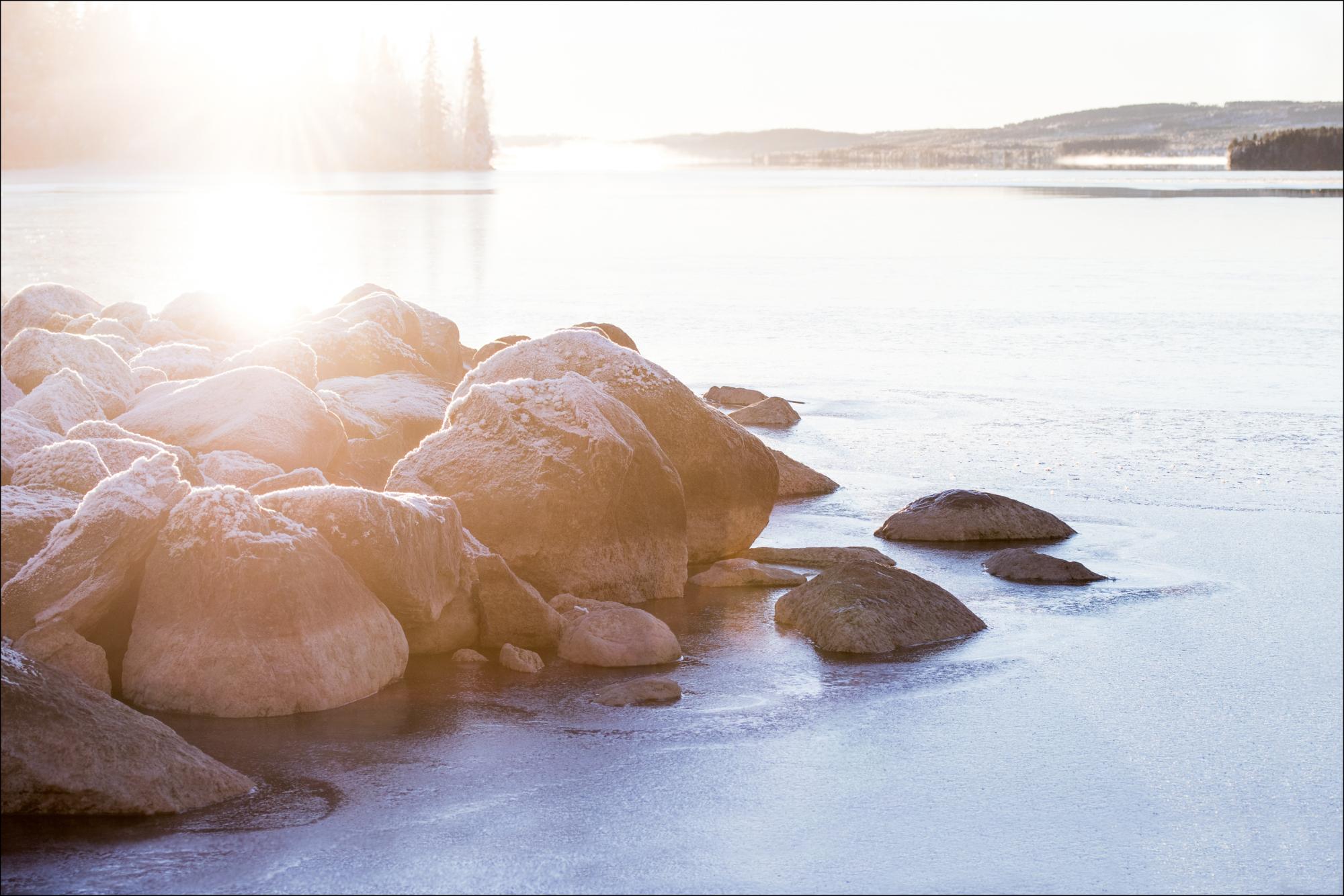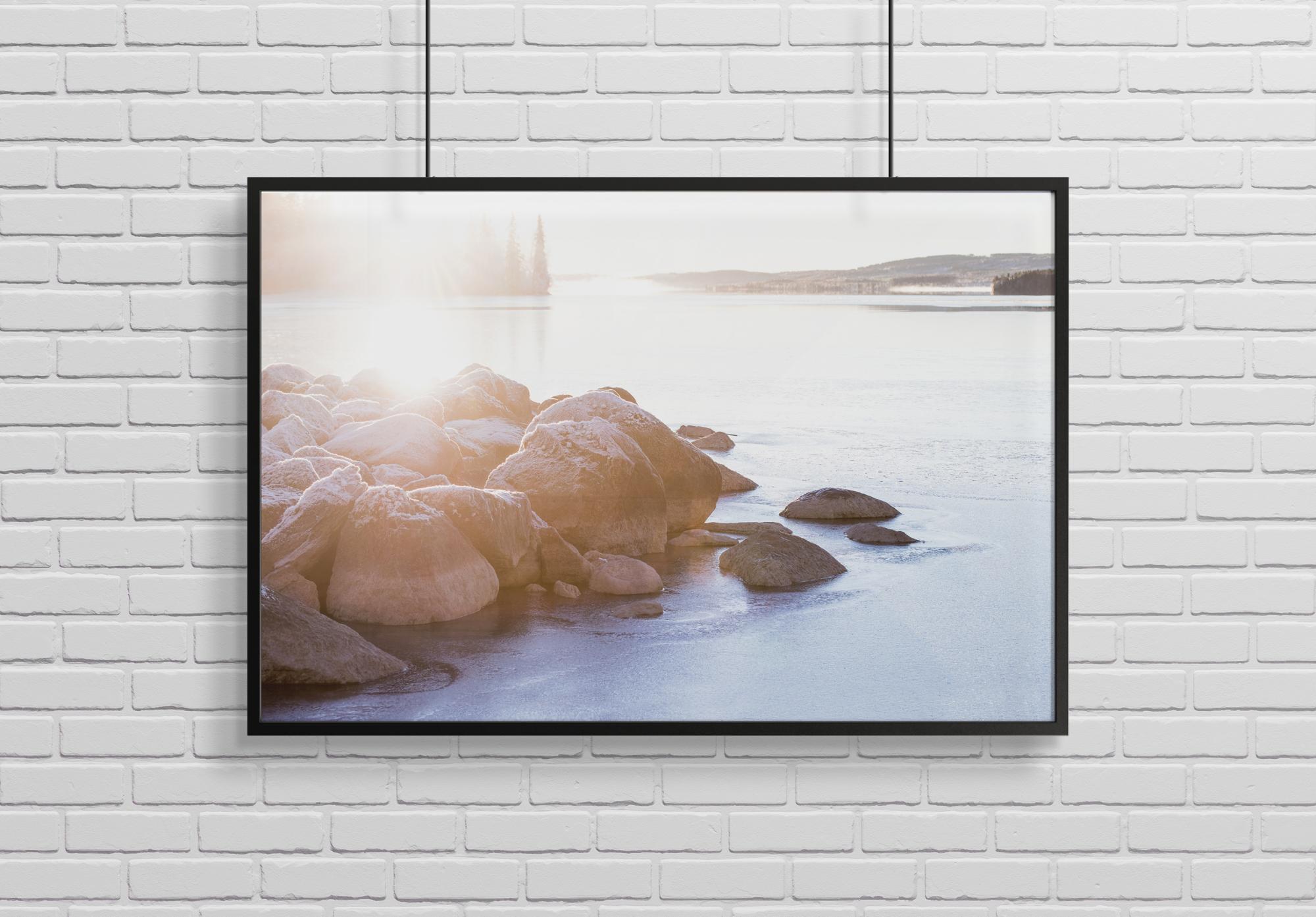 Една ослепителна плакат на пейзаж с скали до морето рано сутрин. Морската вода отразява слънчевата светлина през кафявите каменни блокове и създава бяла повърхност. С ниската земя на заден план, този печат ще освети вашата всекидневна.