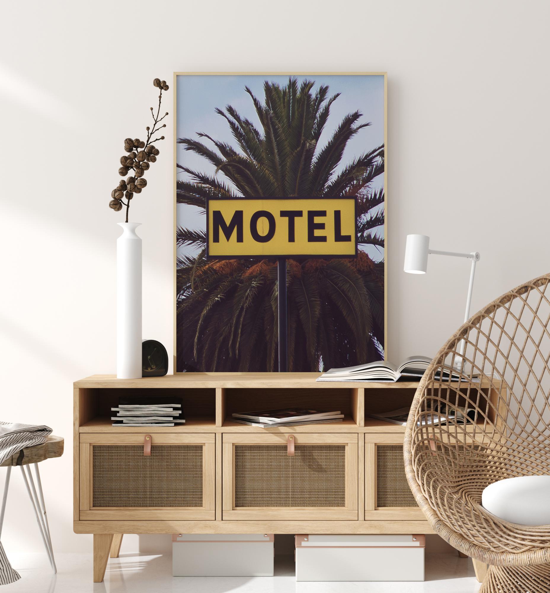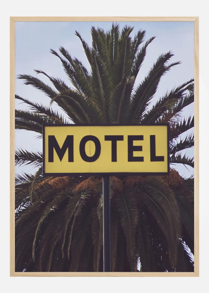 Изчистен и ясен печат на знак на мотел пред голяма палма, която се извисява на синьото небе. Черният надпис е написан на жълтия фон на постера. Огромните клони с палмови листа са в различни цветове, от зелено до светло кафяво. Перфектен печат за стена в рецепцията на мотела.
