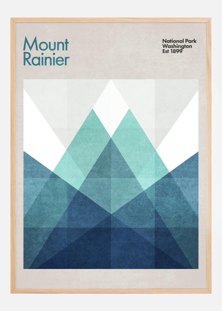 Този графично стилен постер отдава почит на Националния парк Mount Rainier във Вашингтон, създаден през 1899 г. Със серия от припокриващи се триъгълници, създаващи абстрактен образ на планината, дизайнът използва сенки от синьо и тюркоазено, за да предаде разнообразния терен и драматичния пейзаж, с който паркът е известен.