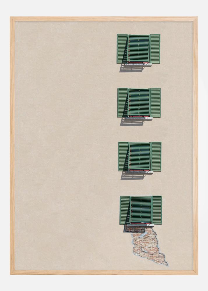 Творбата, която може да има заглавие "Съседски спор", представя радикален контраст между реда и хаоса чрез синхронизираните капаци на прозорците в сравнение с последния прозорец, където част от стената сякаш се е срутила. Единните зелени капаци на прозорците срещу едноцветния фон намекват за вид предвидимост и рутина, докато повреденият прозорец с откритите тухли нарушава тази хармония и въвежда история на евентуален конфликт или пренебрегване.
