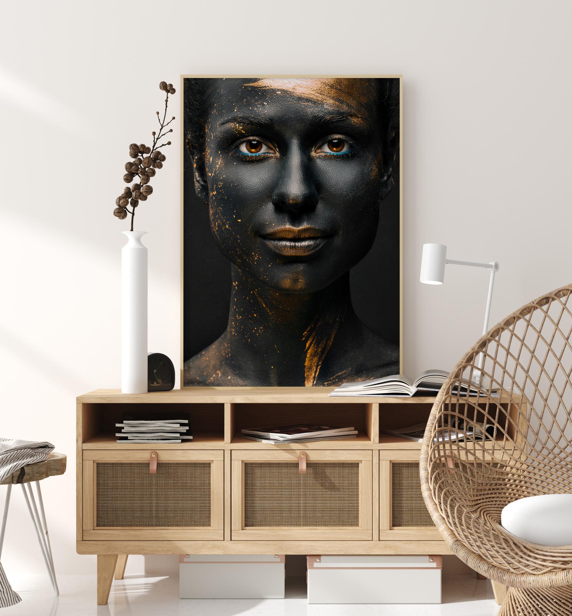 Черен и бял портретен плакат, който изобразява усмихната дама с лице, боядисано в сиво. Лицето на жената е напръскано със златна боя на челото, устните и шията. Очите на жената, които гледат право в камерата, са подчертани със синя очна линия, която създава интензивен поглед. Този красив принт показва изображение на перфектна красота, което ще озари вашия дом.