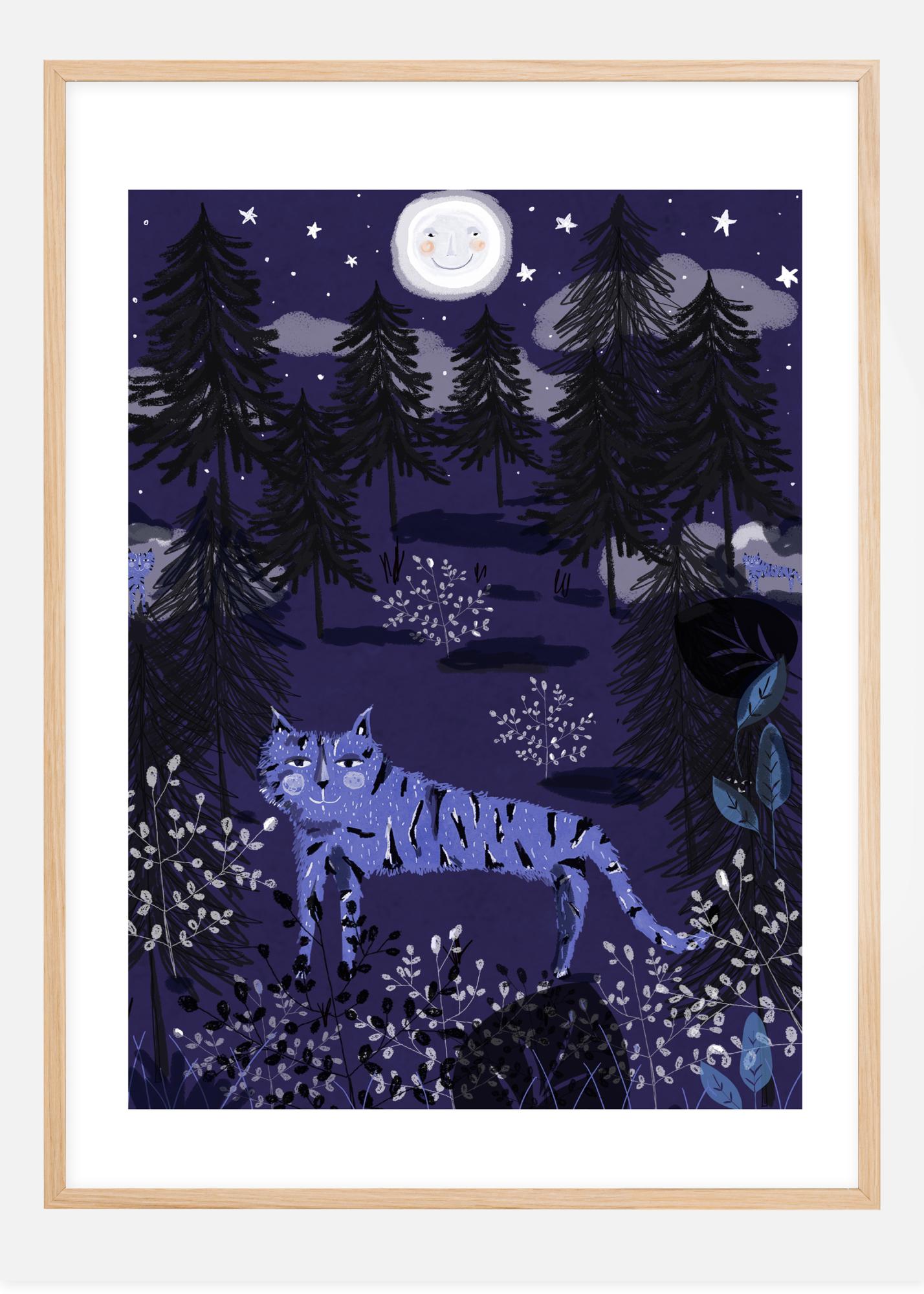 Забавен постер, който показва гора през нощта с усмихната луна и тигър. Лилавото небе е изпълнено с облаци и блестящи звезди. На заден план боровете стоят високо, докато луната ги наблюдава. Тъмнолилавите и зелени цветове създават топло усещане, докато малките бели храсти добавят онази малка допълнителна светлина към изображението. Перфектно изображение за детската стая.