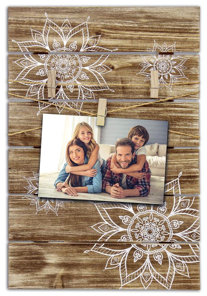 Това е красива рамка колаж, където снимките се закрепват с декоративни дървени щипки. Снимките се закрепват към дървена основа с боядисани в бяло цветя в бохемски дизайн. Рамката има място за две снимки с размери 10x15 см. Външните размери на рамката са 32x48,5 см. Тази рамка колаж може елегантно да се комбинира на стената с други картини, за да създаде стилно цяло във вашия дом. Има стенна стойка.