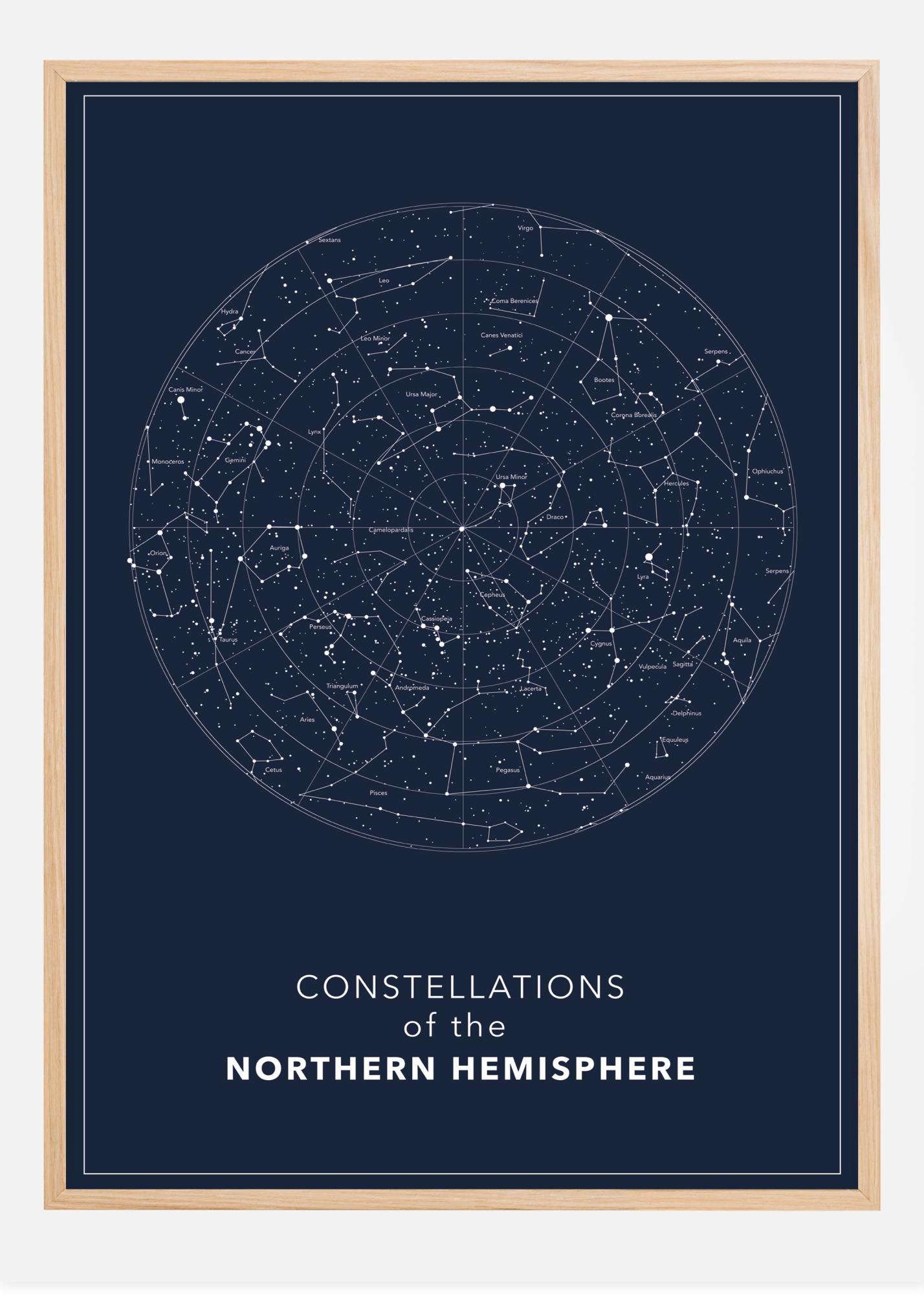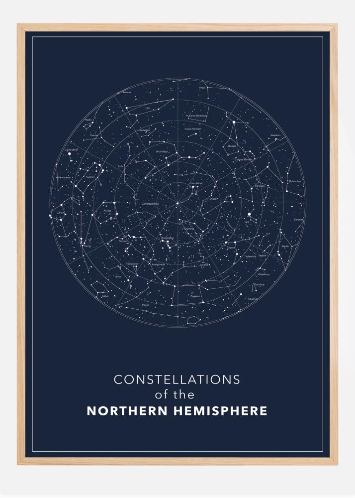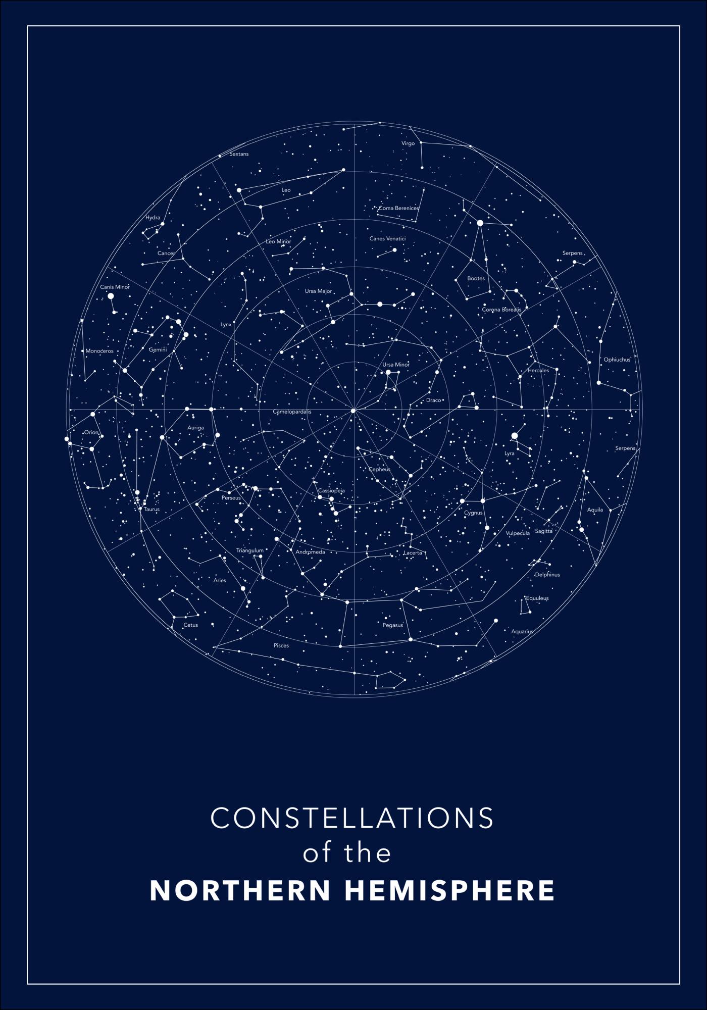 Един блестящ постер с бял кръг със съзвездия на северното звездно небе. Съзвездията са подчертани с тънка бяла линия с името, написано под всяко съзвездие. Срещу тъмносин фон, това е много ясна визуализация на северното звездно небе. Това е перфектен принт за окачване в читалня.