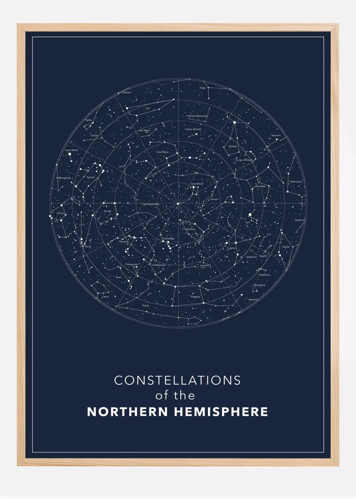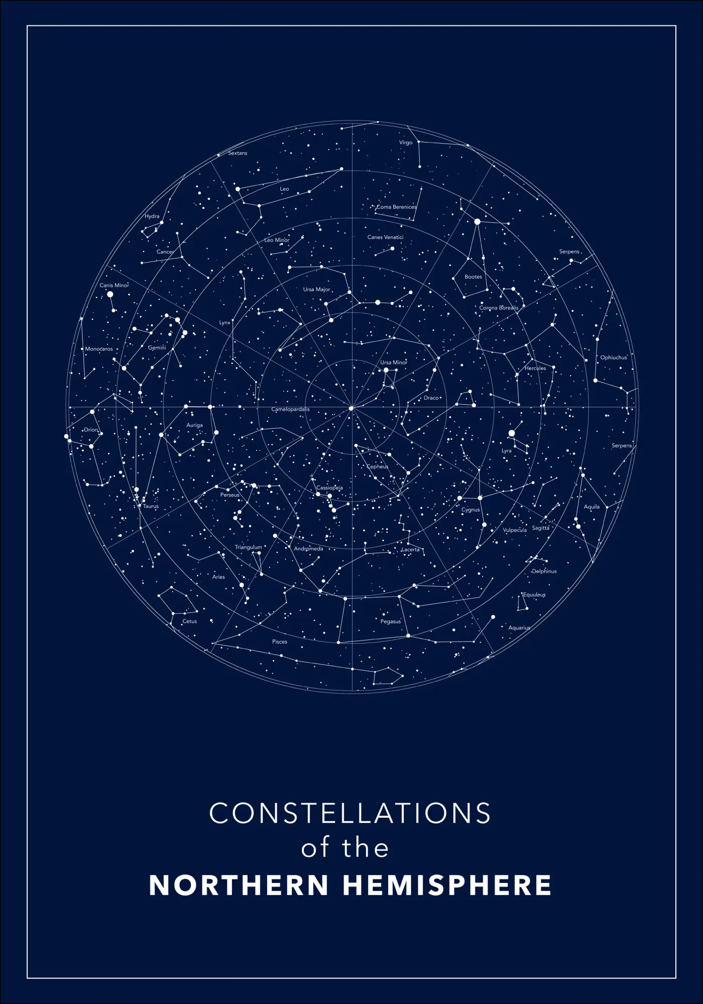 Един блестящ постер с бял кръг и съзвездията на северното звездно небе. Съзвездията са подчертани с фина бяла линия с името написано под всяко съзвездие. На тъмен син фон това е много ясна интерпретация на северното звездно небе. Това е идеален принт за окачване в читалня.