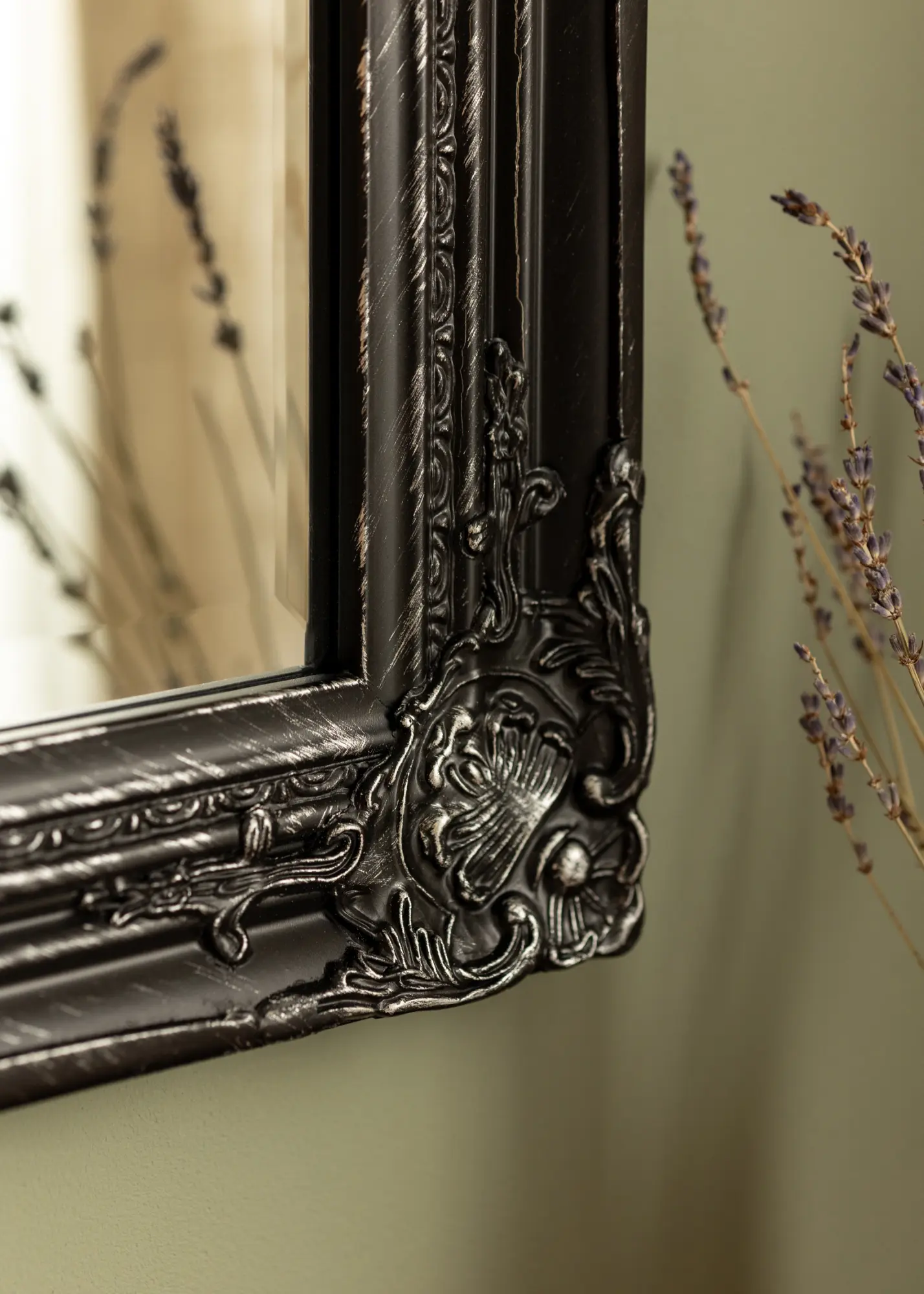 Огледалото Antique Черно е стенно огледало с традиционен формат и форма. То има дървена рамка с красив класически декор, който е излят в гипс и след това приложен върху рамката. Тази рамка прави огледалото красива декорация, която ще привлича внимание.