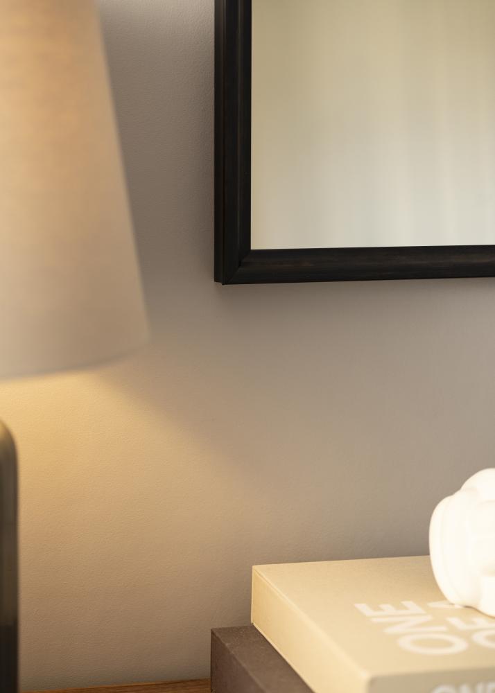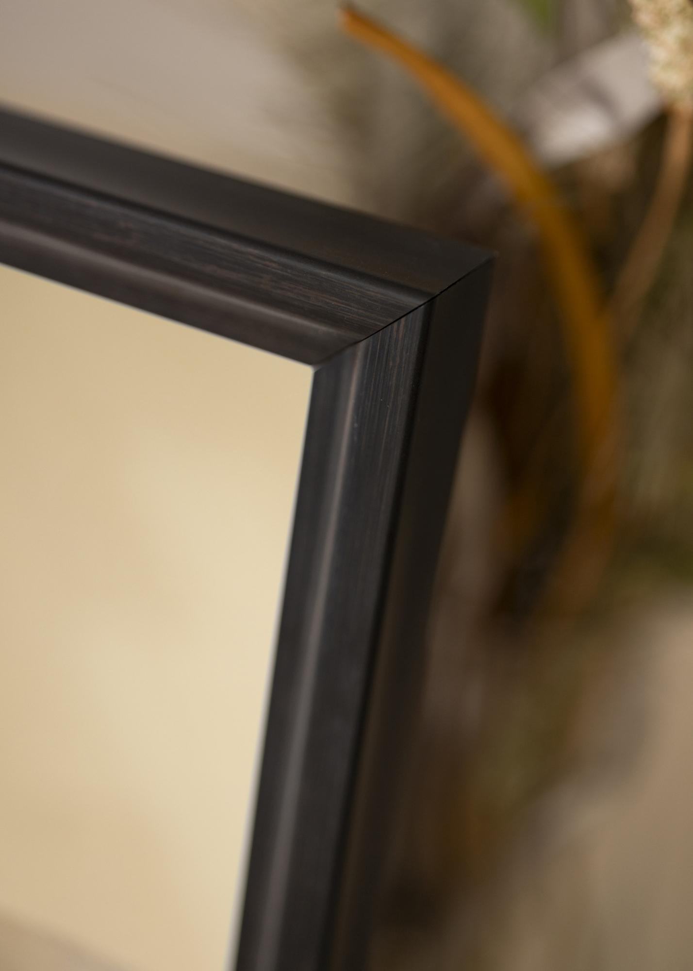 Традиционална рамка за огледало в тъмен черно-кафяв цвят, който е по-близо до черно, отколкото до кафяво. Отличен избор, когато търсите огледало с поръчкови размери в тъмен нюанс, където се вижда структурата на дървото и дава по-живо излъчване на огледалото в сравнение с изцяло черен профил.