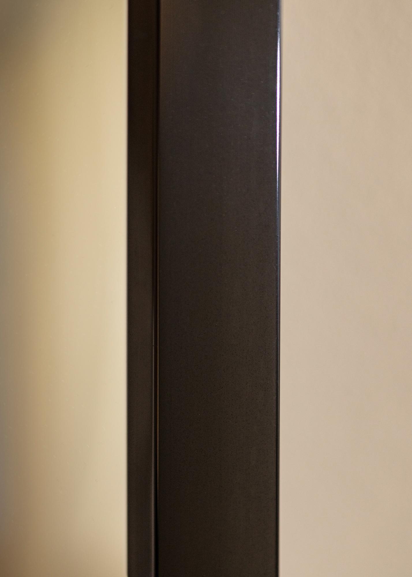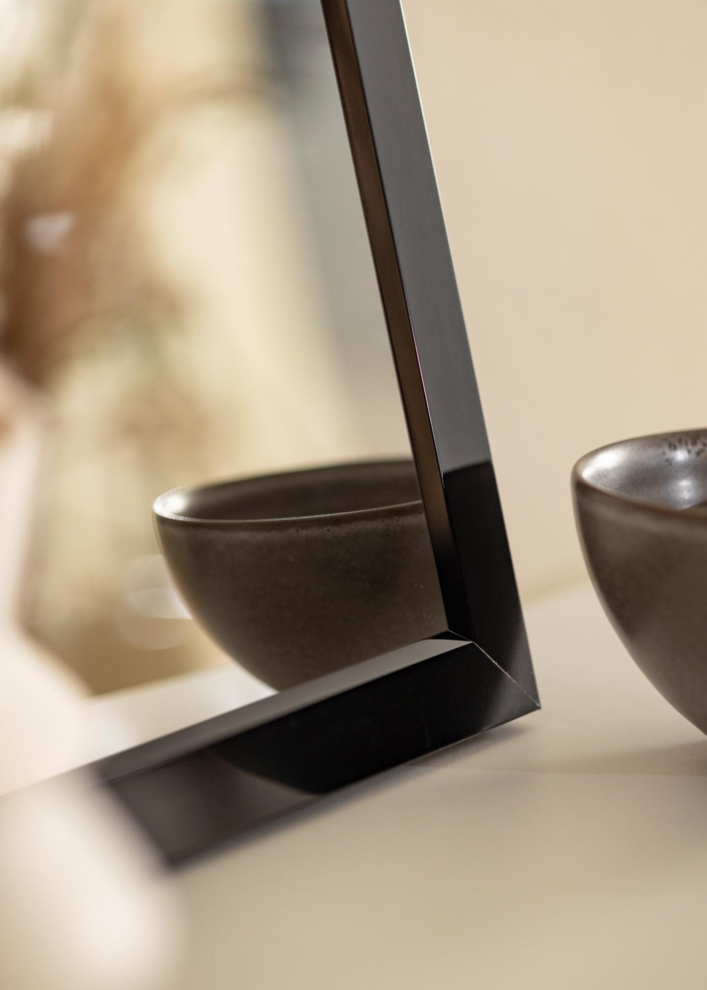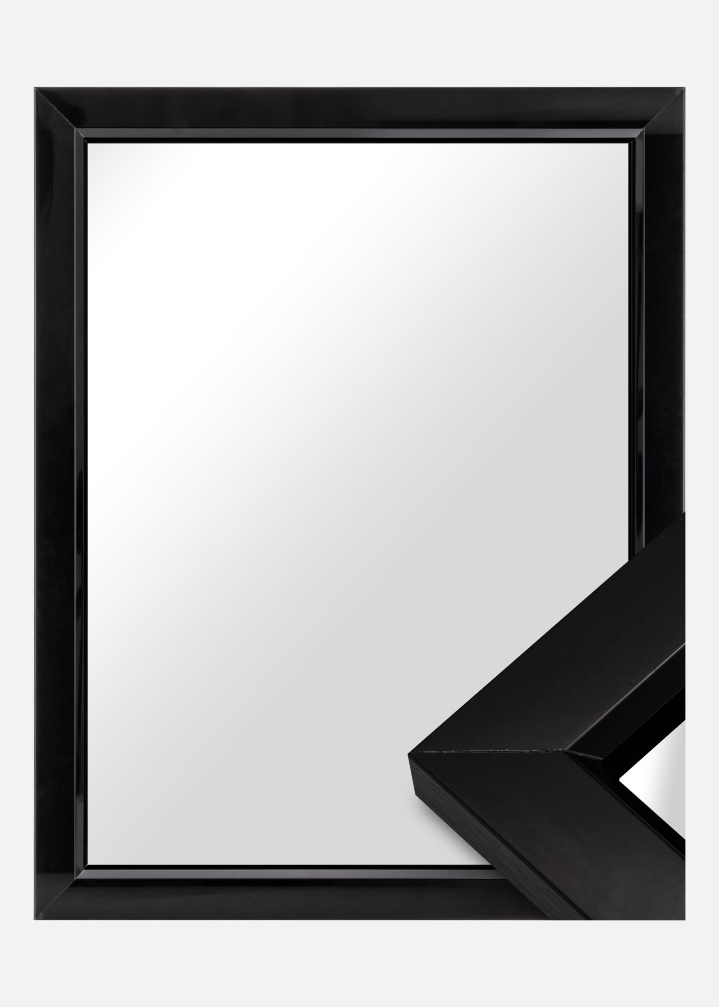 Черно стилно огледало с висока гланцова повърхност, с рамка изработена от алуминий с вътрешен наклон. Графичната маскулинна осезаемост на огледалото може да даде вълнуващ контраст на по-мека интериор, но блестящото лакиране също прави огледалото подходящо за модерни индустриални интериори. Закачете огледалото заедно с графични плакати или картини с черни рамки. Като го поставите срещу прозорец, се създава усещане за простор в стаята.