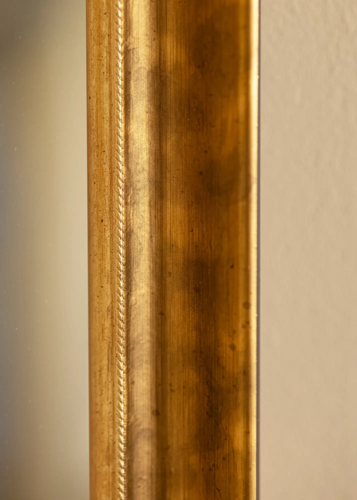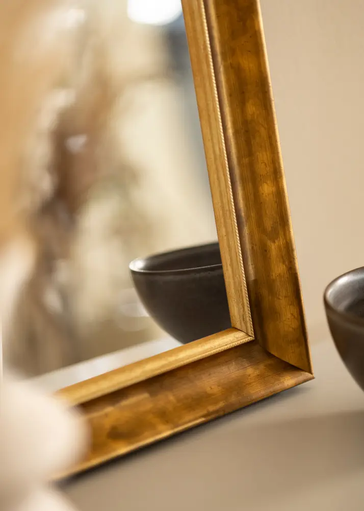 Елегантно огледало с избран размер и прекрасен античен профил в злато с нотки на мед. С широкия и дълбок профил, това е огледало, което гарантирано се забелязва.
