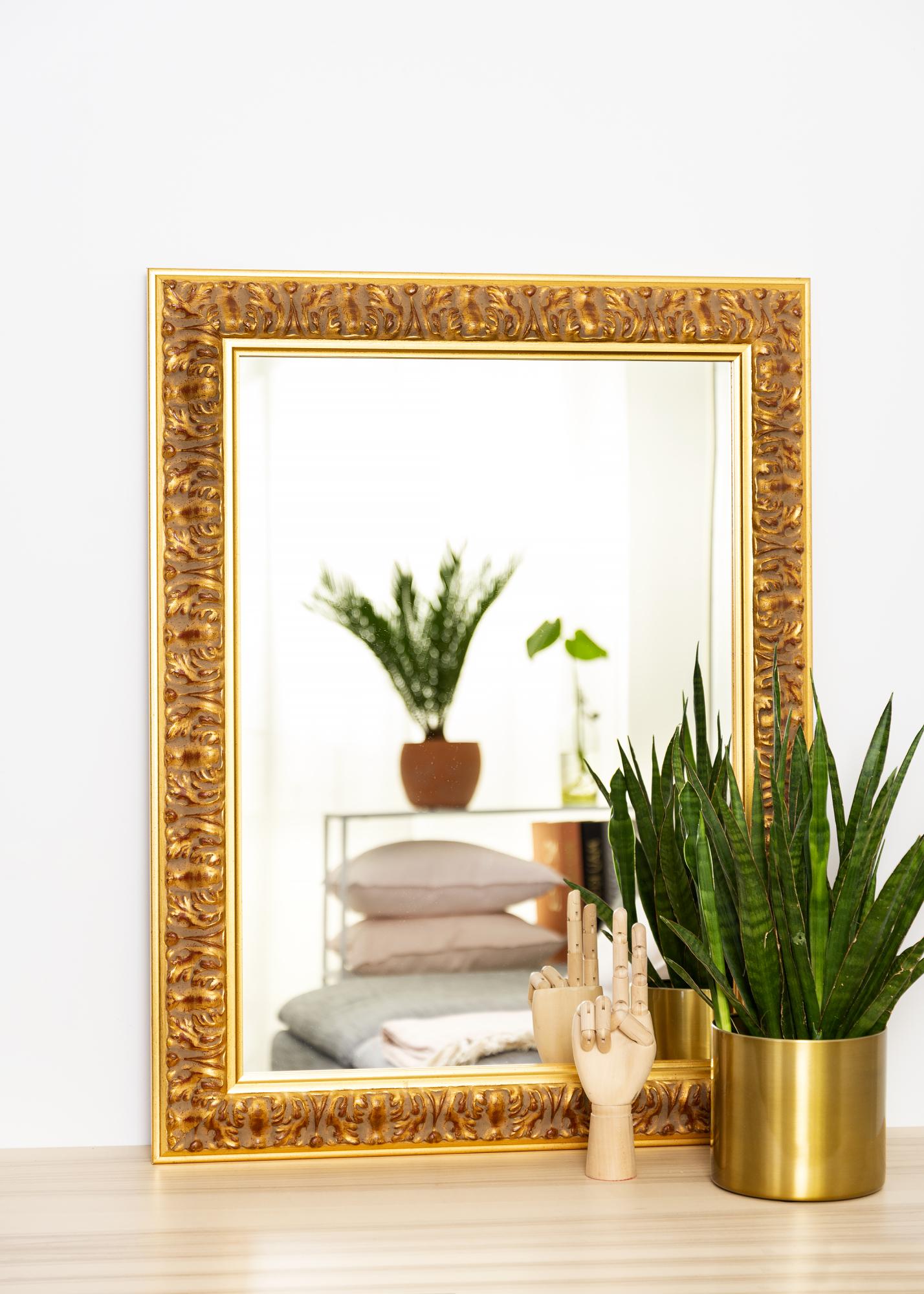 Придайте на вашия дом луксозно докосване с декорации, които напомнят за барока. Това огледало е с високо качество и има елегантна барокова рамка. Рамката е изработена от дърво от устойчиво горско стопанство и е боядисана в различни златни нюанси. До стъклото преминава тънък, светъл златен кант. Тъй като огледалото се предлага в 7 различни размера, ще намерите както огледало за гримьорната маса, така и цялостно огледало.