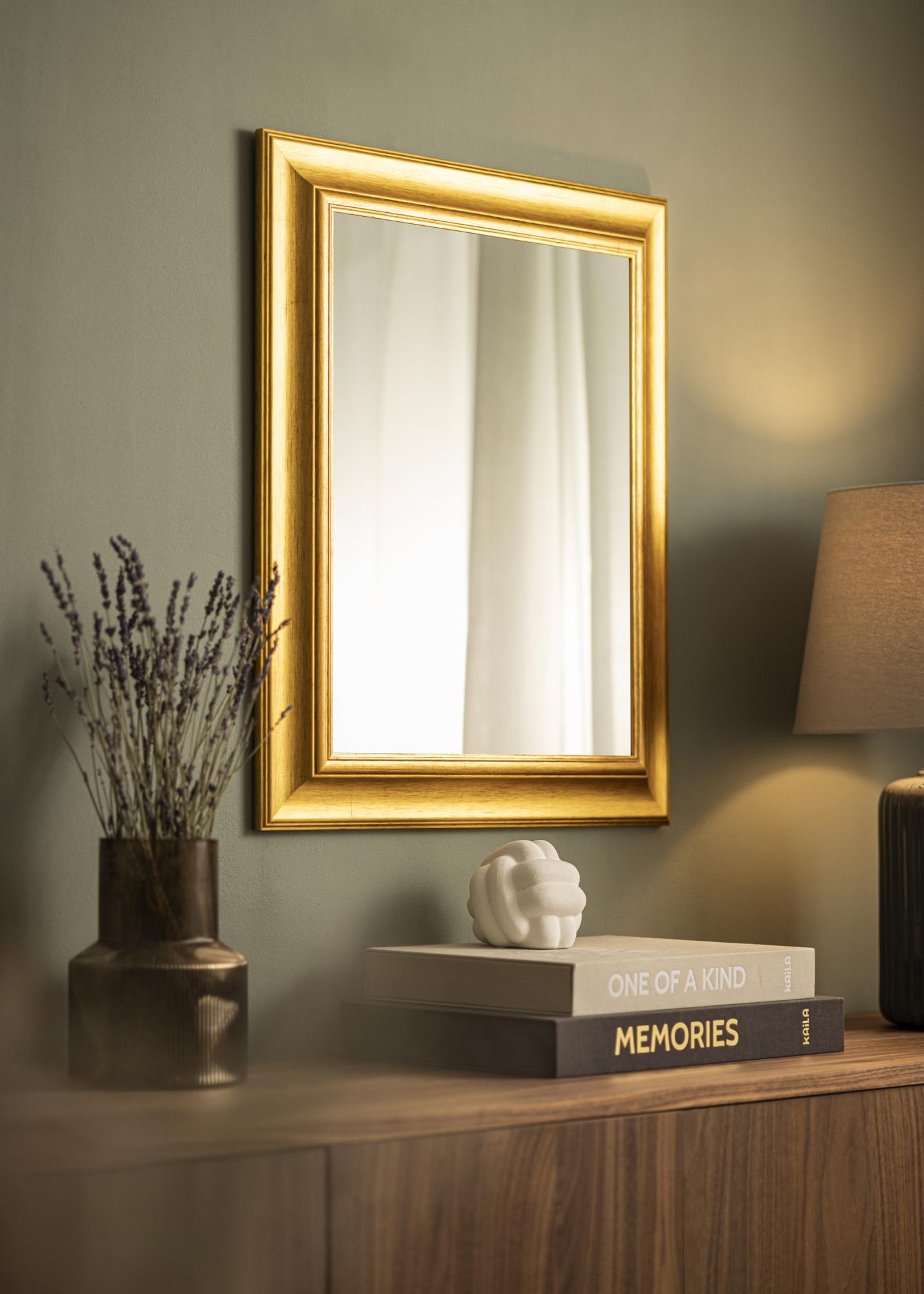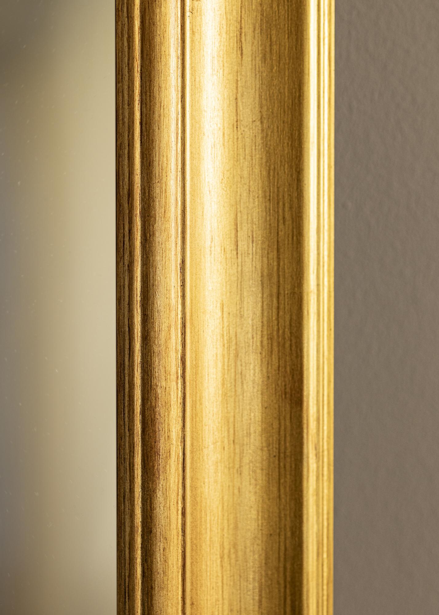Рамката е изработена от бор и има красива антична златиста повърхност. Четканата повърхност с фини нюанси придава на огледалото леко патинирано усещане, което допринася за уникалния му характер. Тънките линии по краищата създават изтънчено богатство на детайлите, което привлича вниманието и усилва класическатa визия на огледалото.