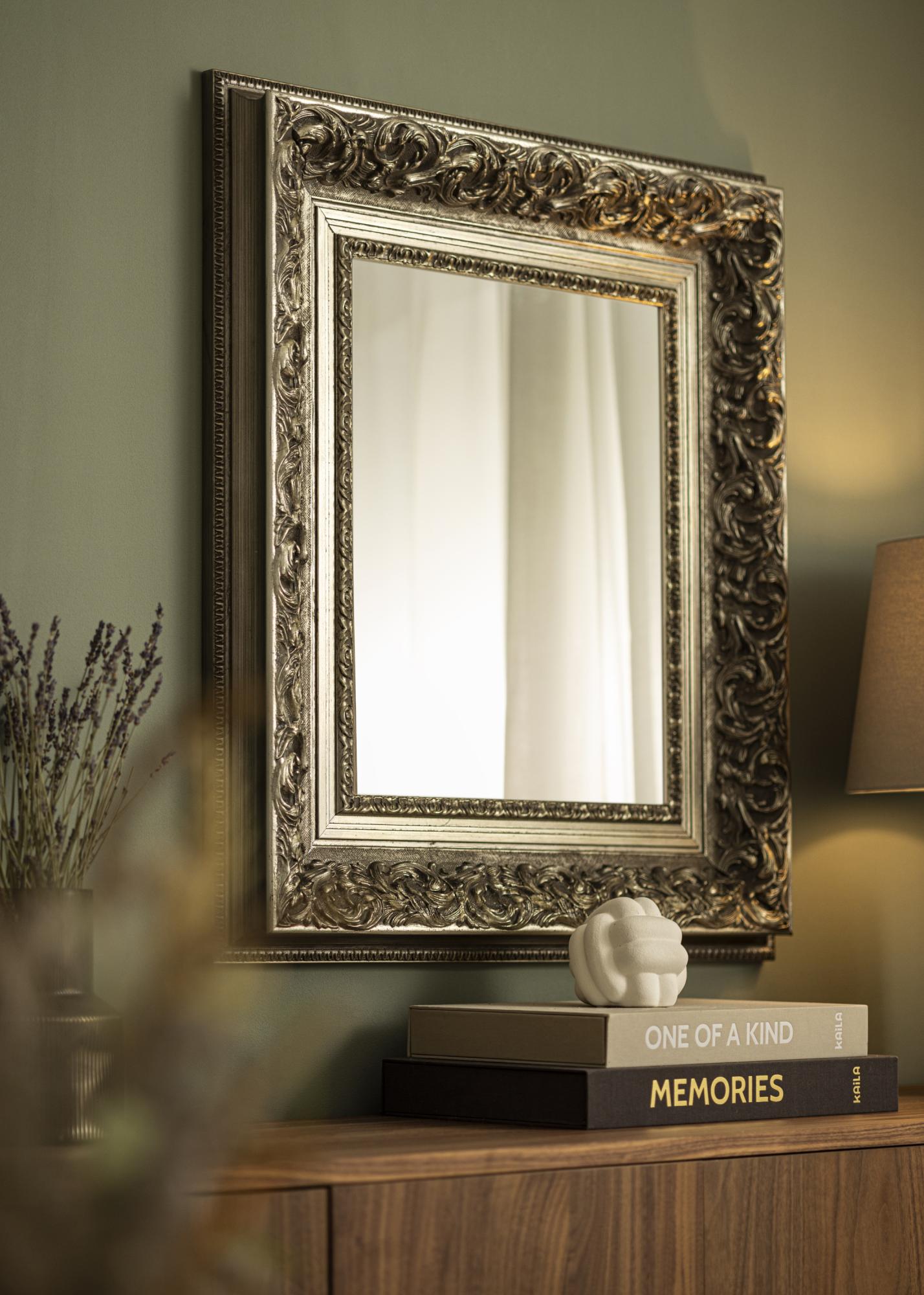 Интригуващото богатство на детайлите в рамката на огледалото е подчертано от дълбокия релеф, където скулптурни листовидни мотиви създават усещане за елегантност и стил. Покритието на рамката комбинира тъмни и светли сребърни тонове, което придава на огледалото красива патина и вечна естетика. Тази комбинация от цветове и мотиви прави огледалото идеален избор за класически мотиви и рамки, които изискват нещо допълнително.