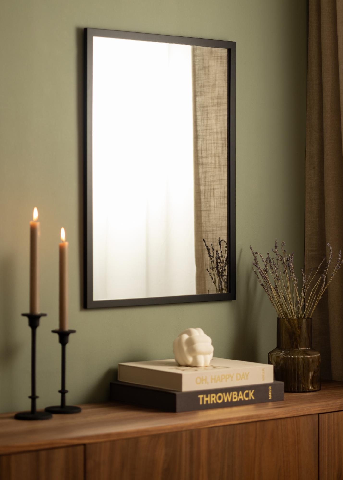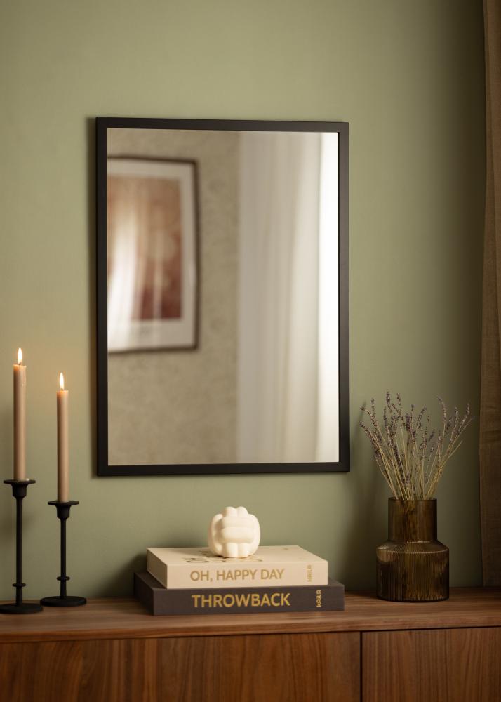 Black Wood е отличен избор за вас, които търсят стилно стенни огледало с обикновена черна рамка. Огледалото е изработено от боядисано айосово дърво и е снабдено с безцветно огледално стъкло. Рамката с ширина 22 мм има традиционен квадратен профил, който позволява на огледалната повърхност да бъде в центъра на вниманието.