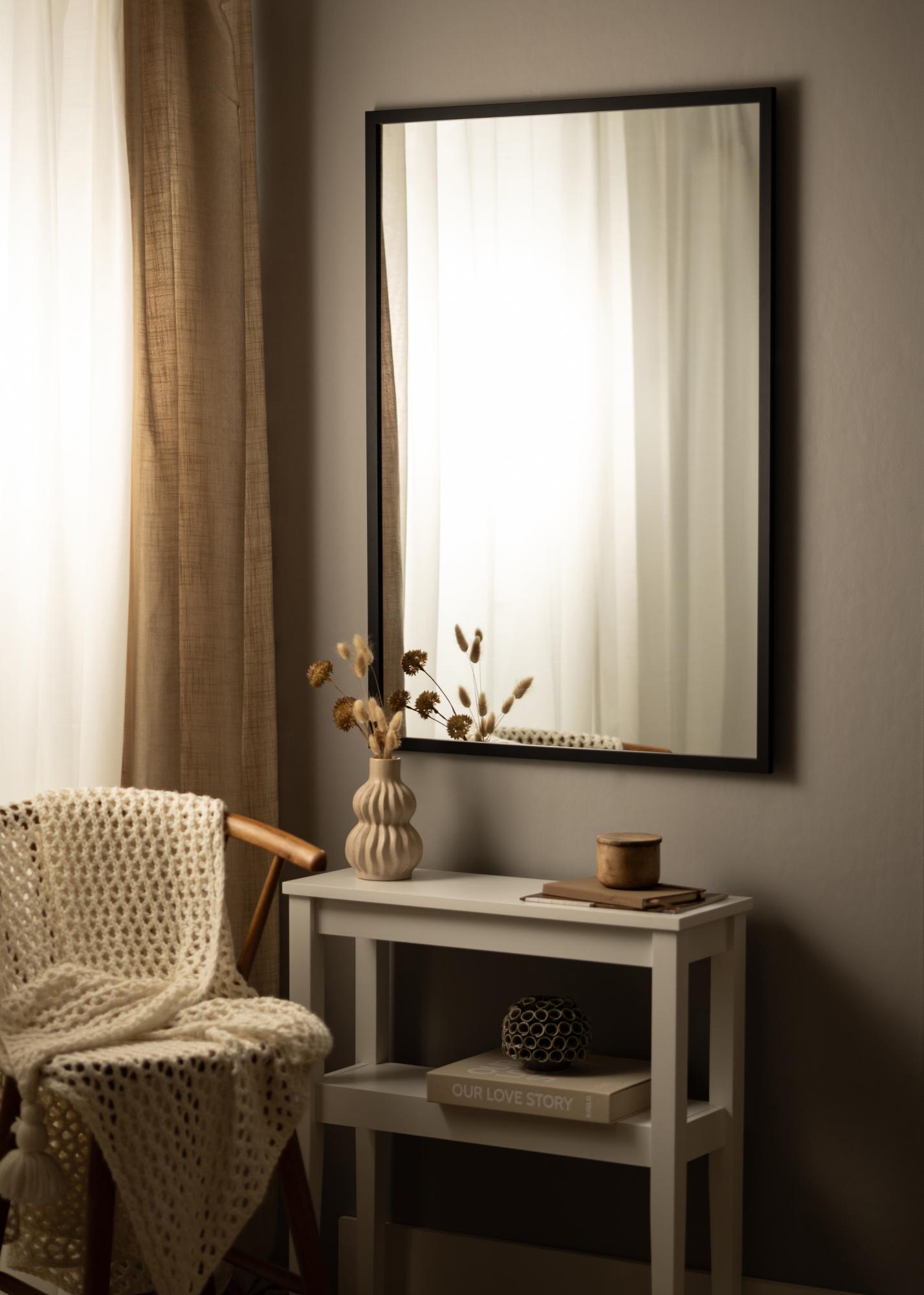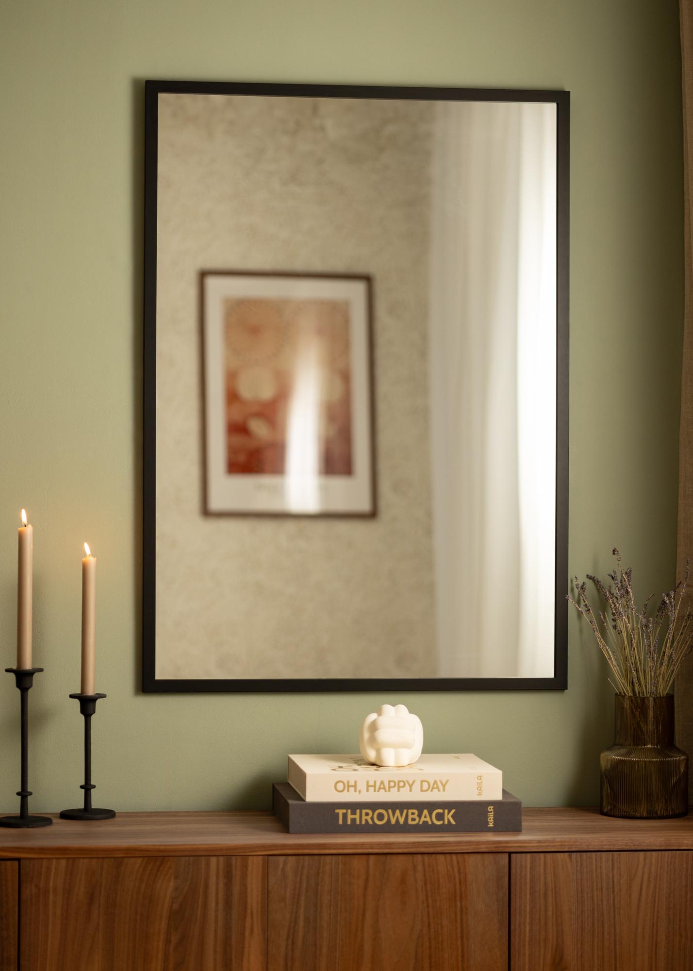 Black Wood е отличен избор за тези, които търсят стилно стеннo огледало с обикновена черна рамка. Огледалото е изработено от боядисано аюс дърво и е снабдено с неоцветено огледално стъкло. Рамката с ширина 22 мм има традиционен квадратен профил, който позволява огледалната повърхност да бъде на преден план.