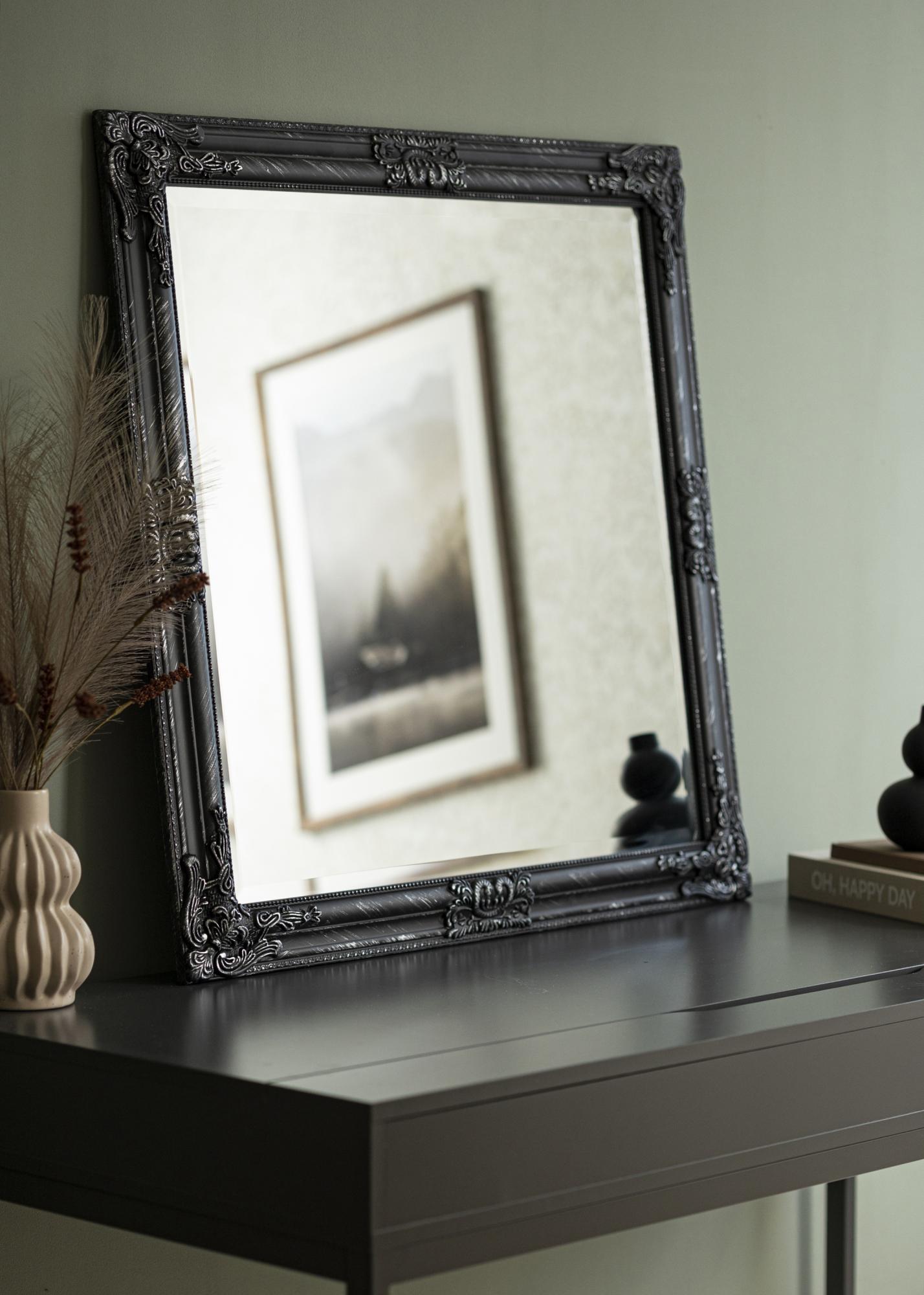 Това огледало изпъква с квадратна форма, която създава структура и ред в стаята, обградено от тъмна, детайлна рамка, която придава изразителен и изискан стил. Черната рамка е украсена с фини детайли, които напомнят за разкошната естетика на барока, което придава луксозен и драматичен акцент на вашия интериор.