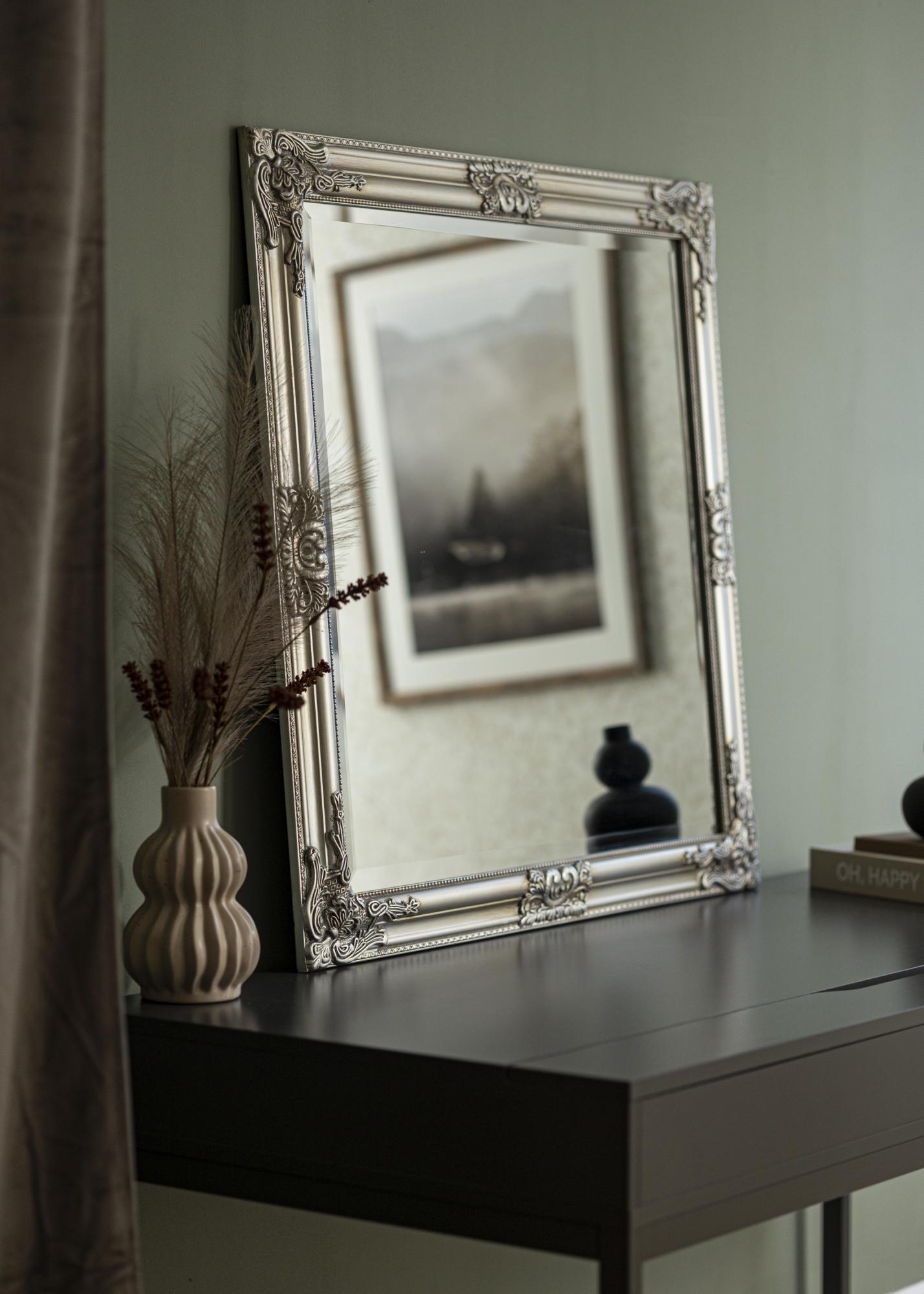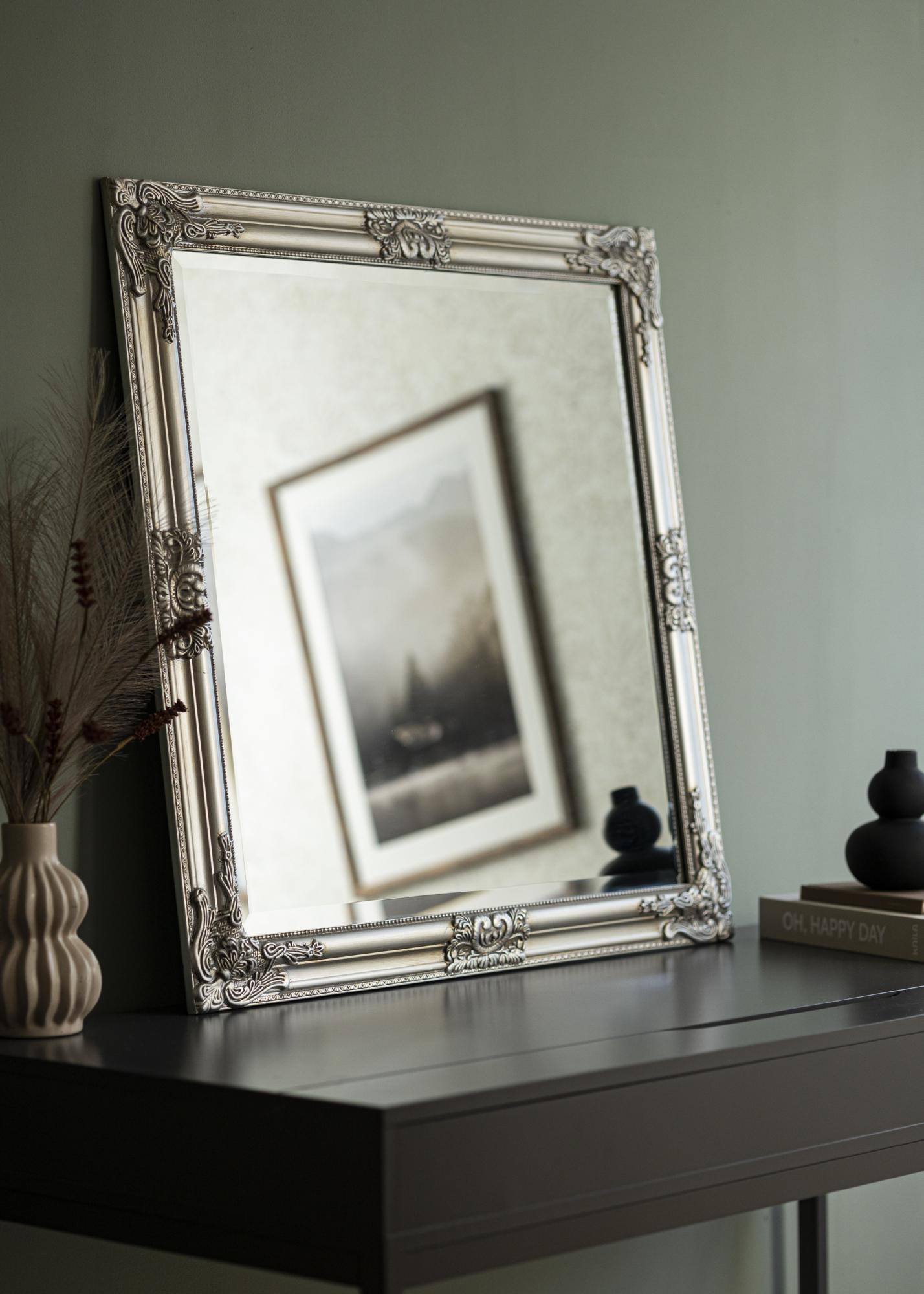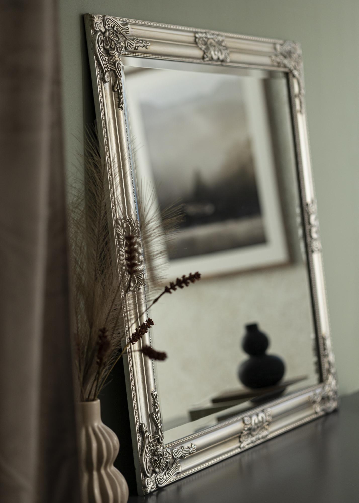 Рамката на това огледало е истински привличач на погледите, богата на детайлни орнаменти в бароков стил, които добавят луксозно и историческо усещане към стаята. Квадратната форма придава симетрична и балансирана естетика, която допълва повечето стилове на интериор. Сребристата рамка на огледалото подчертава неговия елегантен израз и го прави многофункционален елемент в дома.