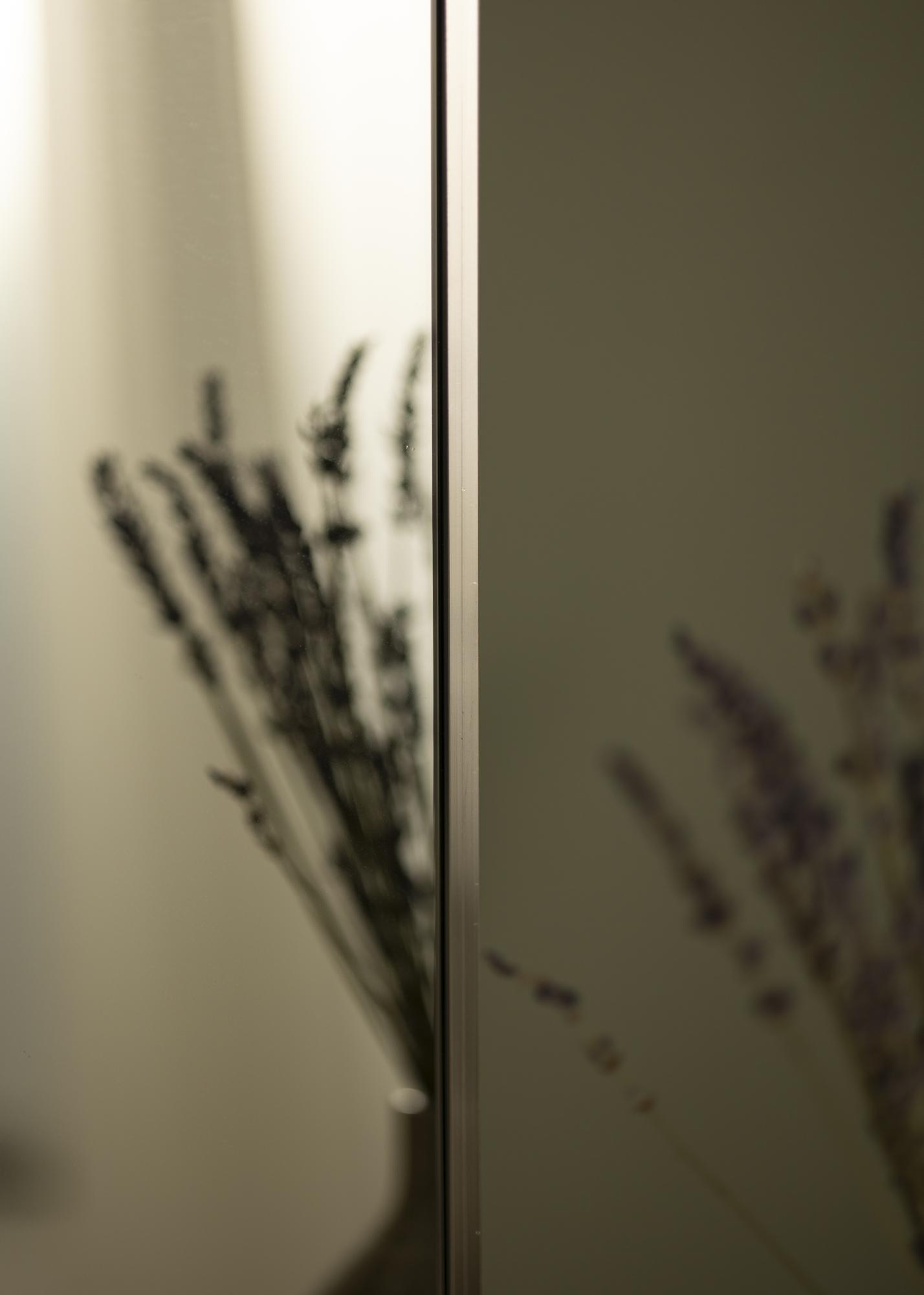 Това огледало е украсено с тънка, сребриста алуминиева рамка, която добавя нотка на изтънченост към декора ви. Правоъгълната форма е едновременно класическа и модерна и се вписва в разнообразие от интериорни стилове. Минималистичният дизайн на огледалото му позволява да се вписва в стаята, но същевременно се откроява като елегантен детайл.