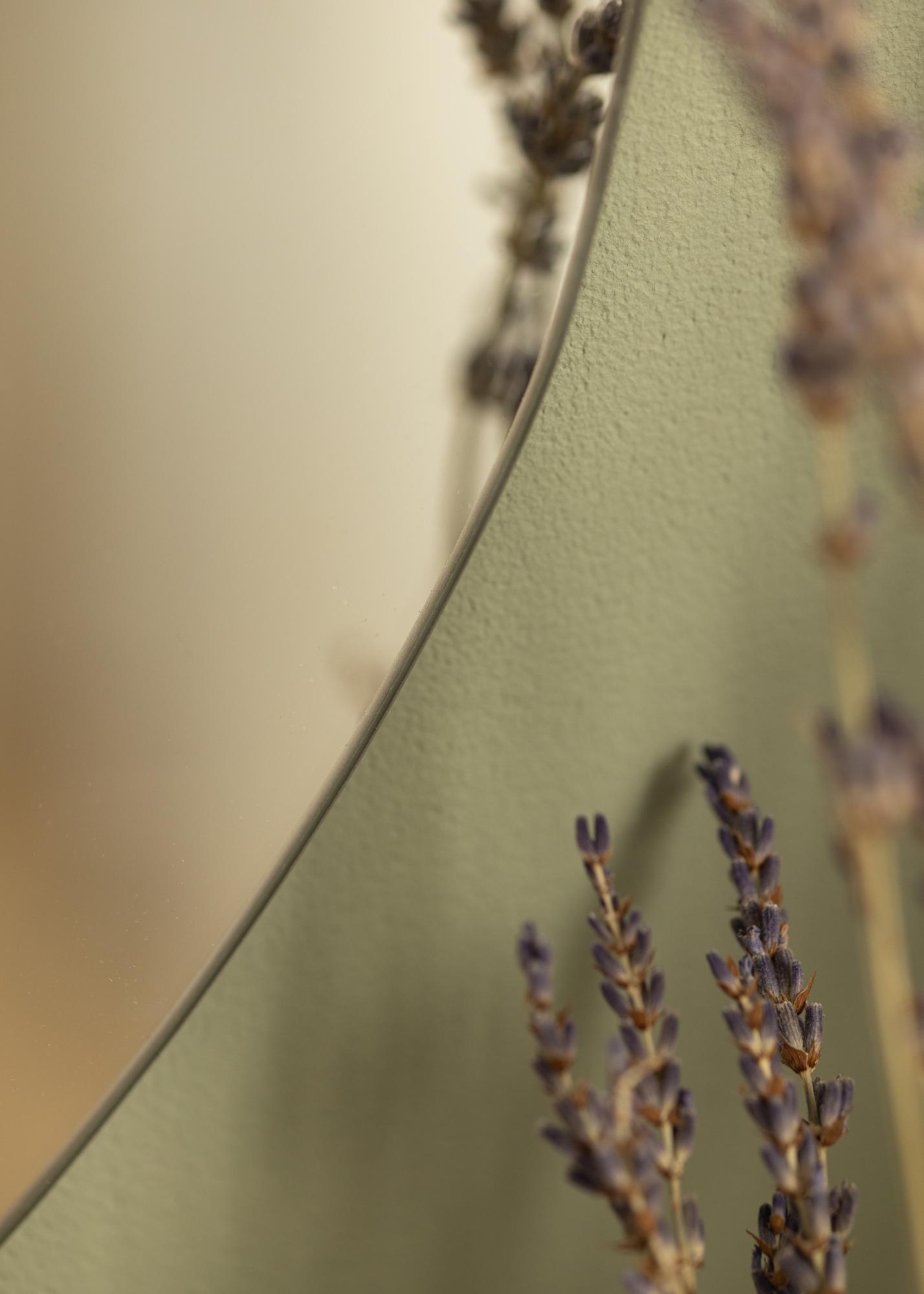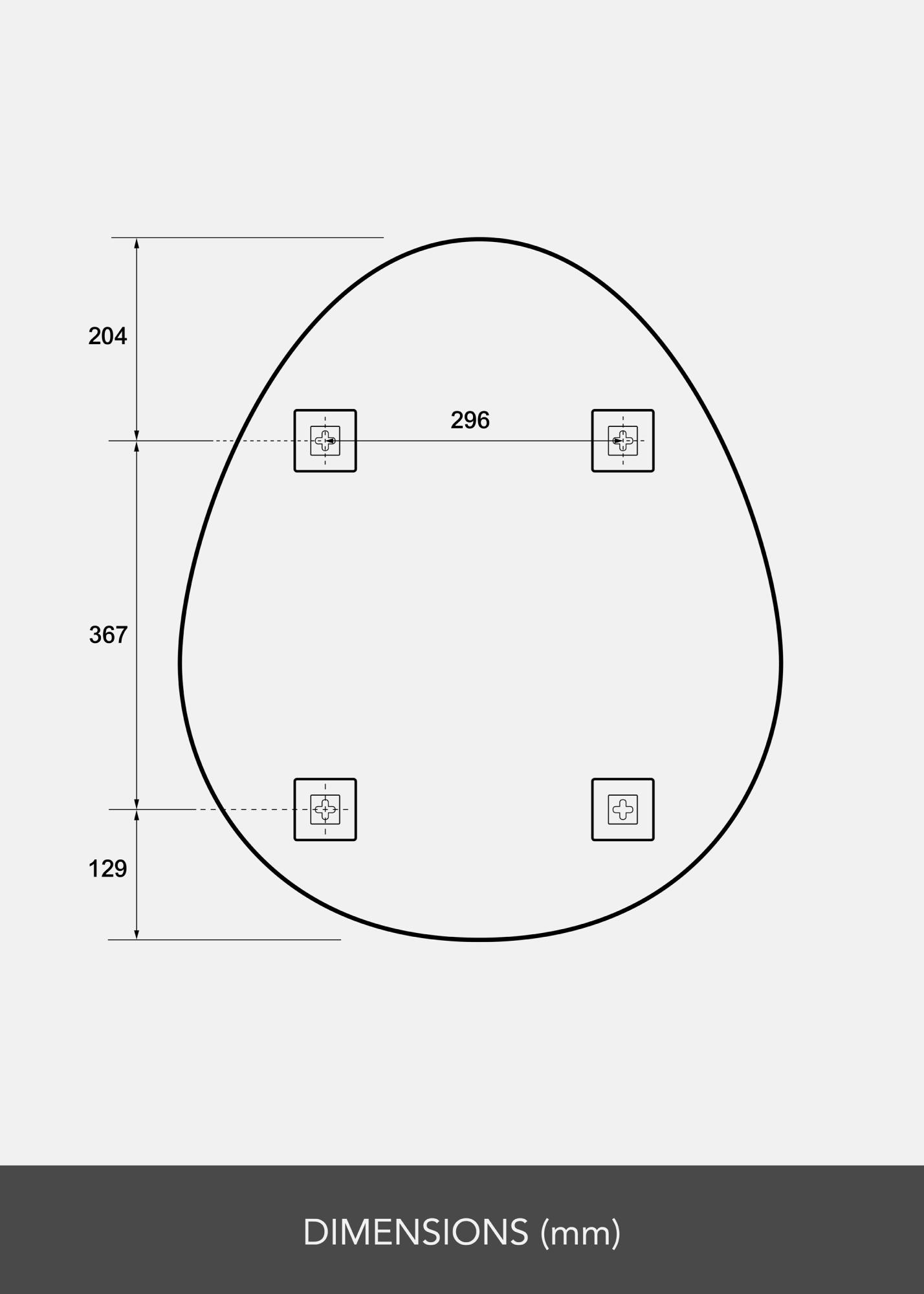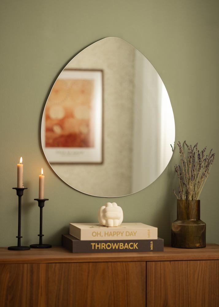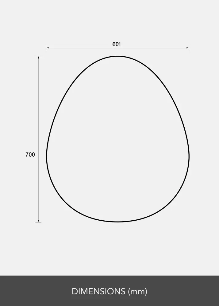 Огледалото има заоблен контур с форма на яйце с плоско дъно, което създава мека и модерна естетика. Уникалната му форма го прави да изпъква сред другите и да бъде интересен повод за разговор. То не е само огледало, но и произведение на изкуството, което разкрасява вашия дом.