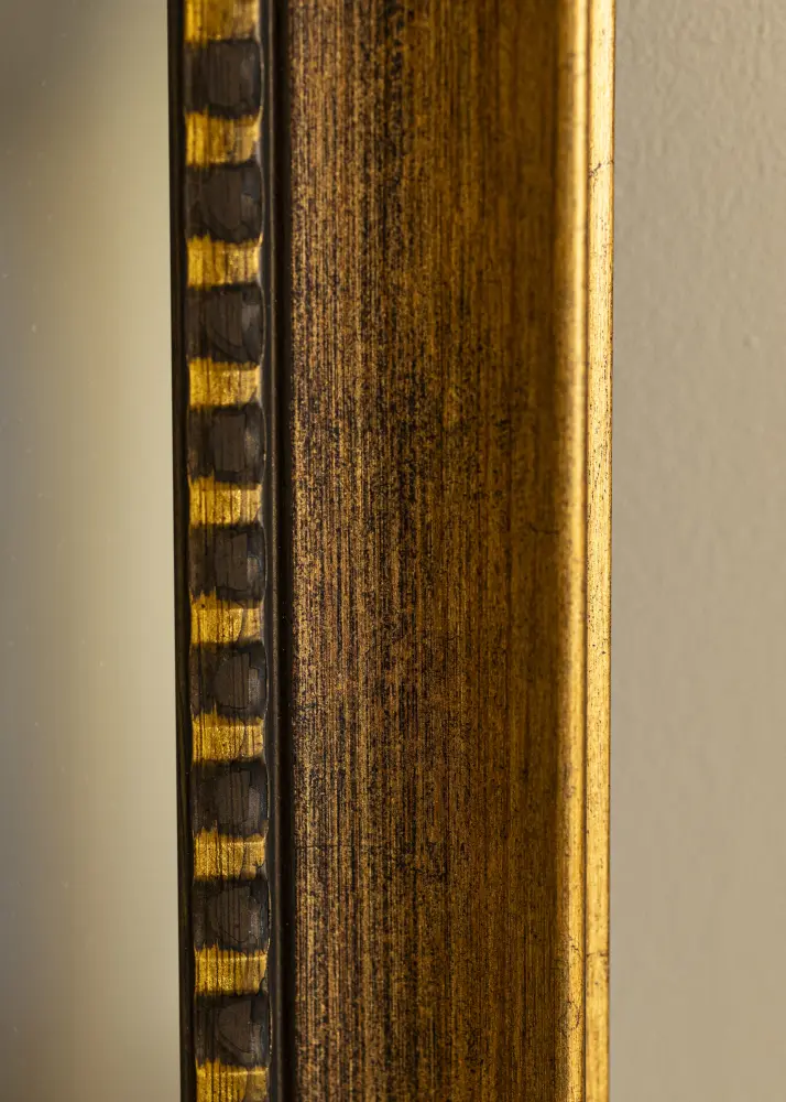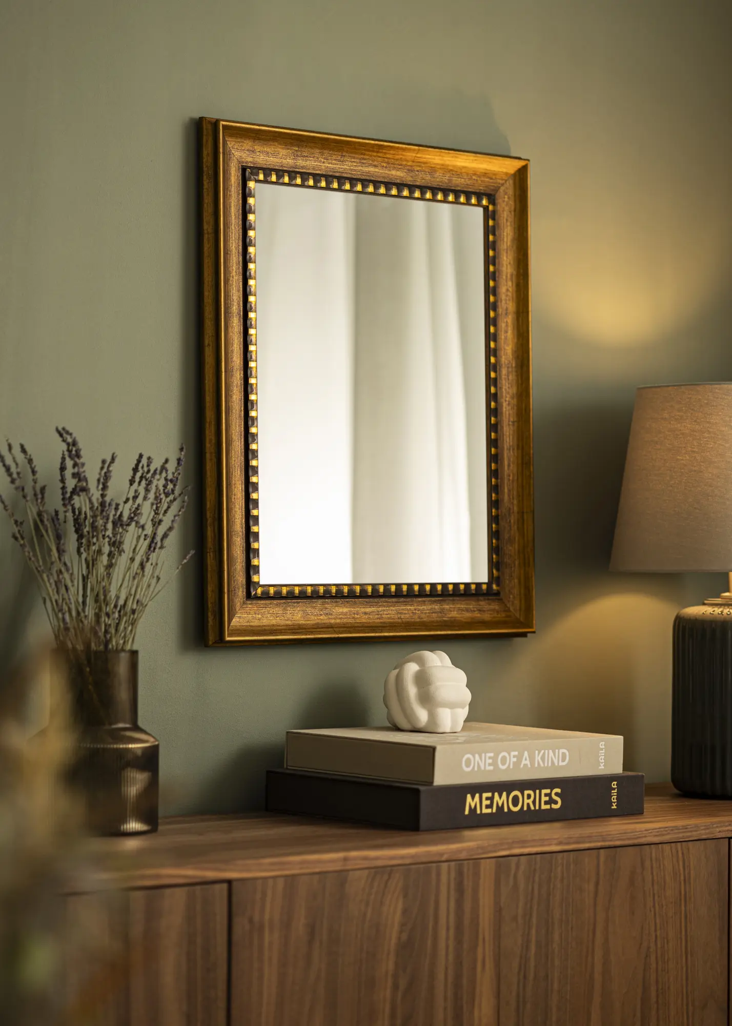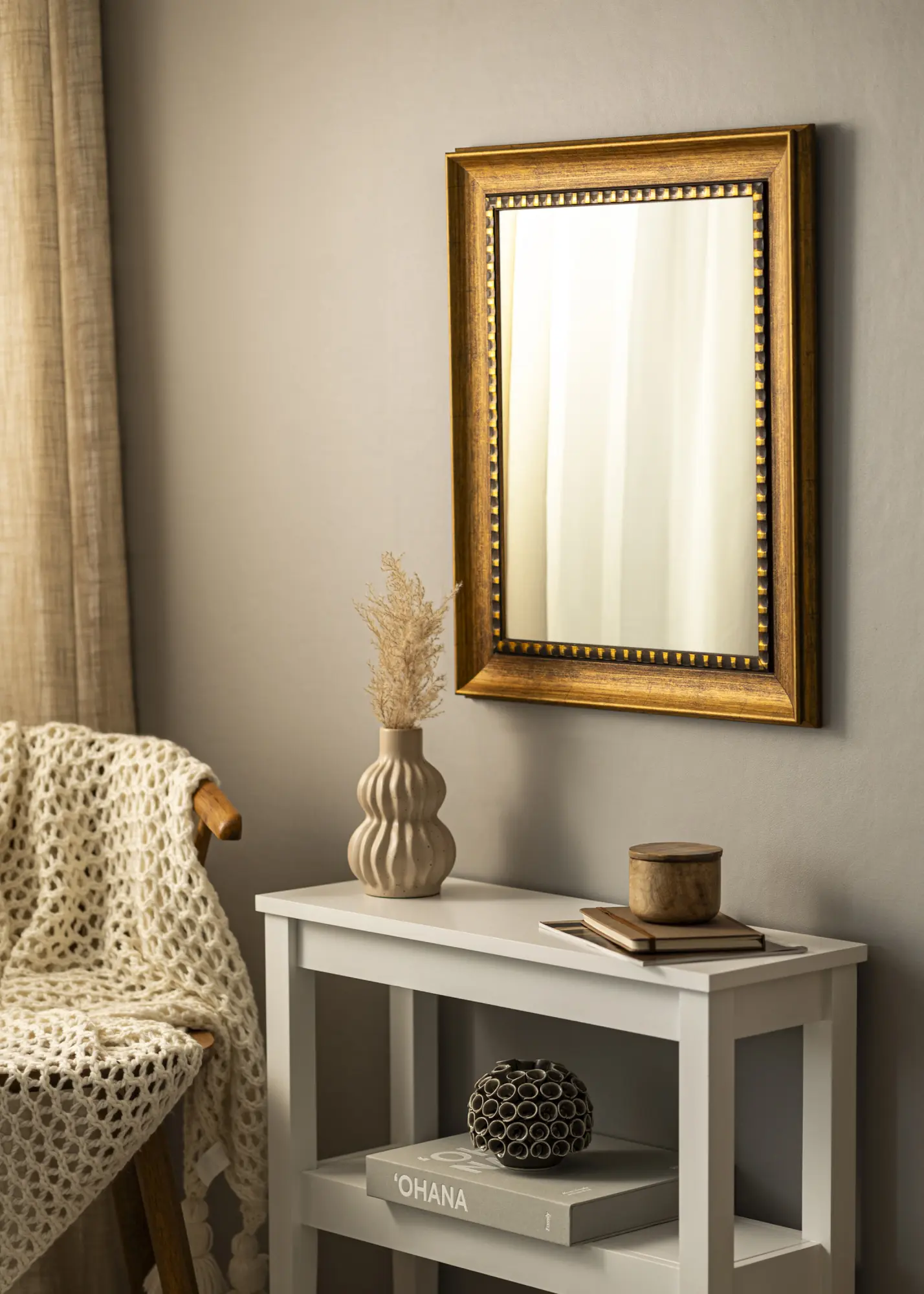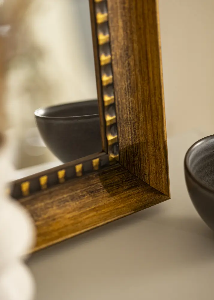 Това огледало има топъл кафяв цвят с елегантен антикварен финиш, който придава на стаята вечна очарование. Широкият профил има лек блясък и е декориран с отличителна раирана детайлност в златно и черно по вътрешния ръб. Това създава красив контраст и привлича погледа към центъра на огледалото.