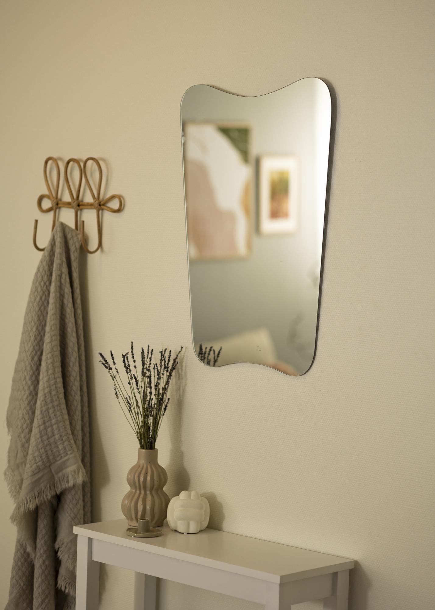 Открийте стилното и модерно огледало, което е проектирано да допълва всяка стая със своя уникален чар. Това уникално оформено огледало има меки, плавни извивки, които придават модерен привкус на класическата правоъгълна форма, и няма видима рамка, което създава безпроблемен и елегантен вид. Със своите щедри размери от 50x70 см, то става практичен и декоративен детайл във вашия дом.