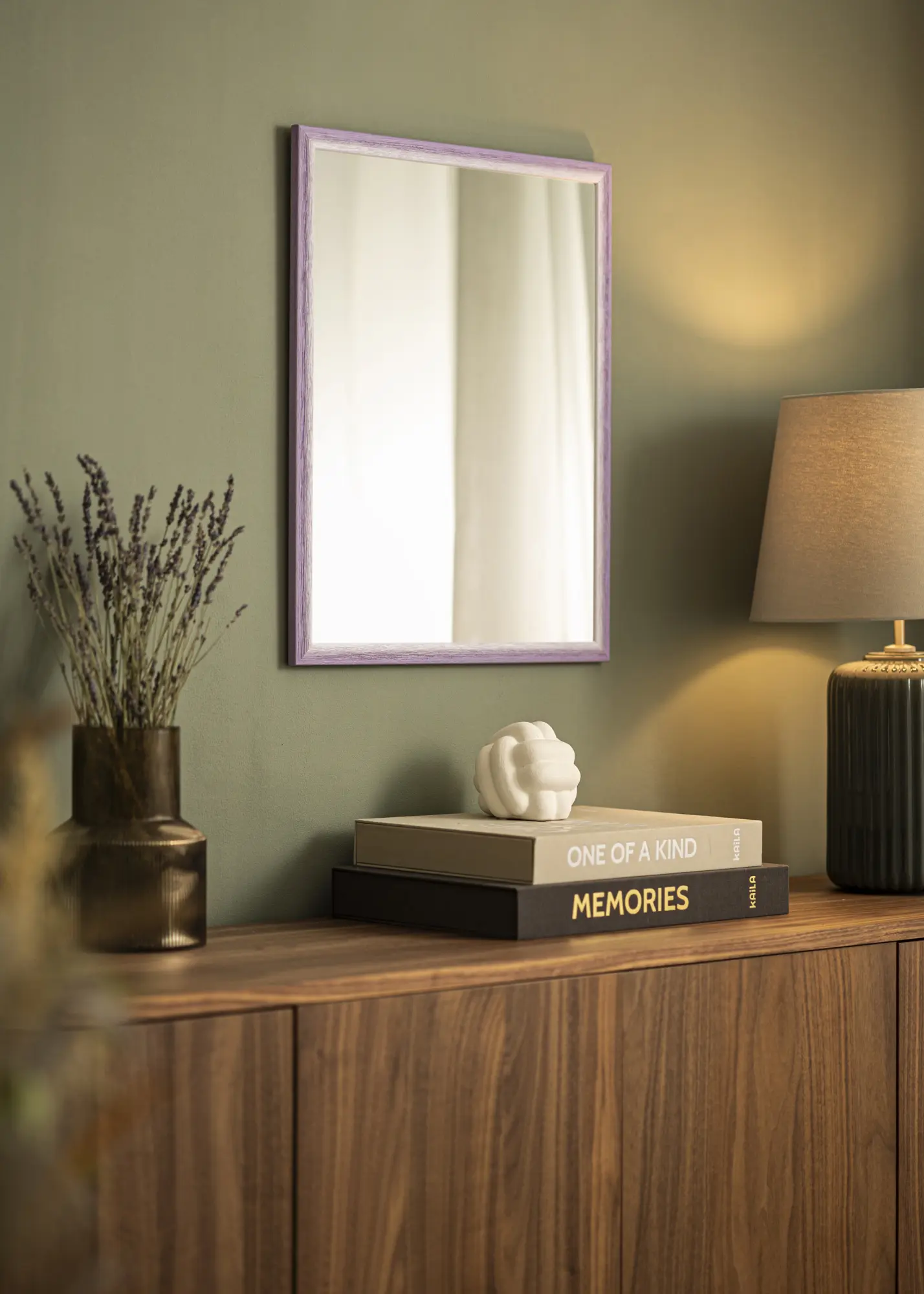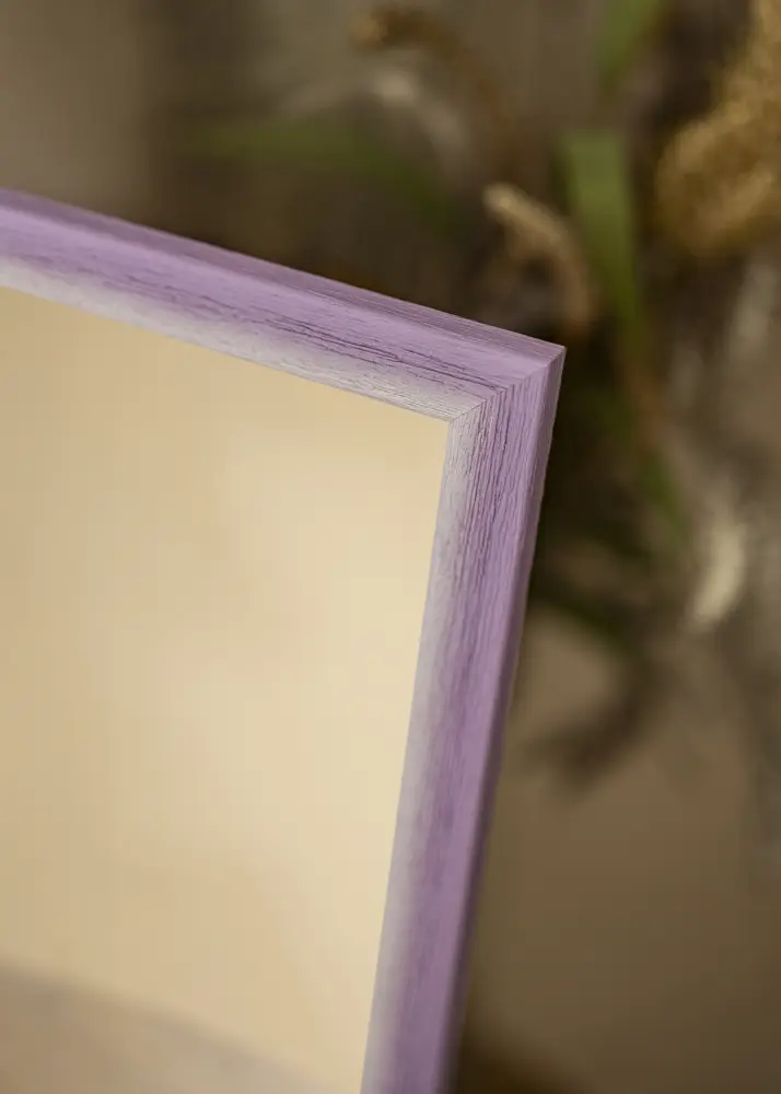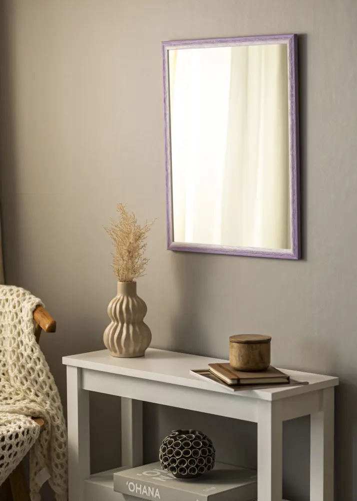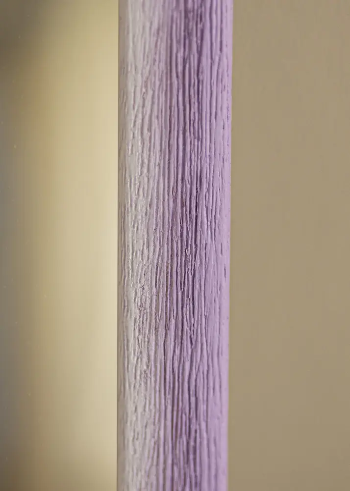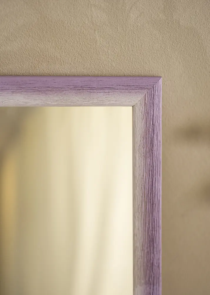 Светлолилавият цвят на огледалото има мека преходност от почти бял тон до мека нюанс на лавандулово лилаво. Това придава на огледалото хармонично и спокойно усещане, което го прави идеално за създаване на релаксираща атмосфера в дома ви. Изявената дървена структура с вертикални жилки допринася за естествено и рустикално усещане, което позволява на огледалото да се вписва добре както в модерни, така и в традиционни интериори.