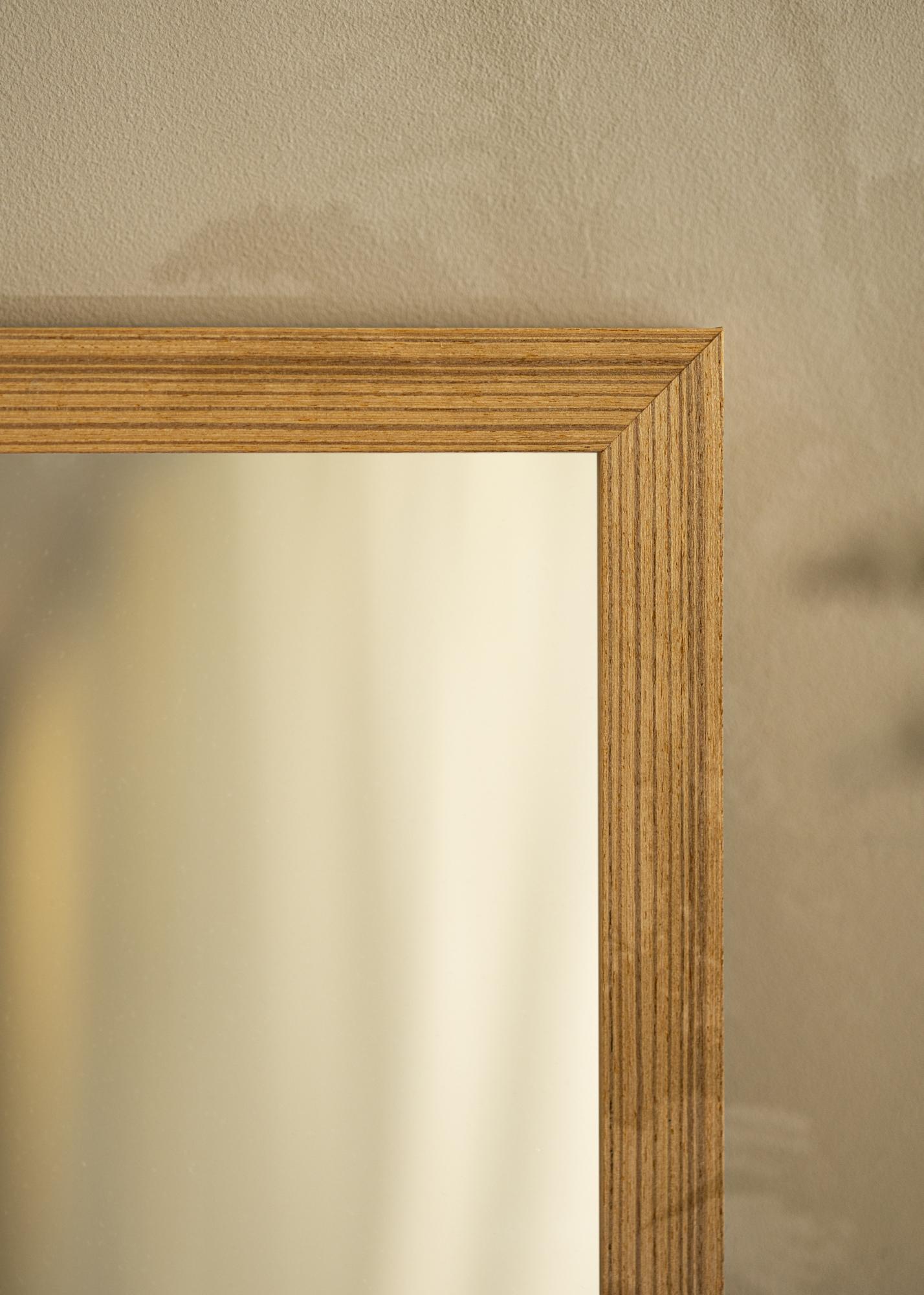 Рамката на огледалото е с широчина 28 мм и има дълбочина от 33 мм, което придава стабилно и здраво усещане. Изработено от бор, това огледало предлага издръжливост, която се запазва с времето. Подчертаната структура на рамката създава живо дълбочина и добавя тактилна измерение, което кара огледалото да се усеща като живо и динамично.