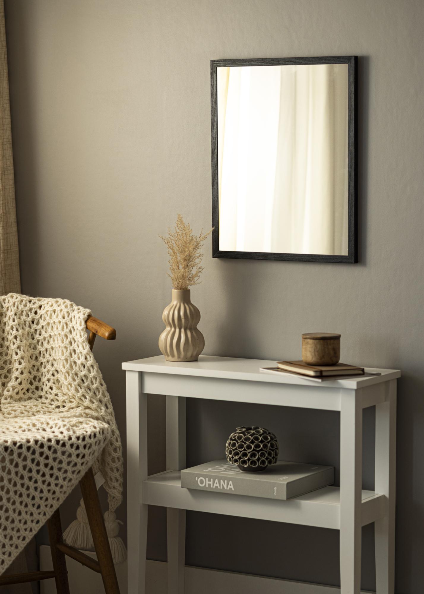Огледало Девон Черно е огледало по поръчка, изработено от нас, за да отговаря на вашите нужди. Със своя дълбок черен цвят и отчетлива дървесна структура, това огледало предлага естествено и рустикално усещане, което лесно се вписва в различни интериорни стилове. Матово покритие заедно с фините жилки подчертава характера на дървото и придава елегантен акцент на вашия дом.
