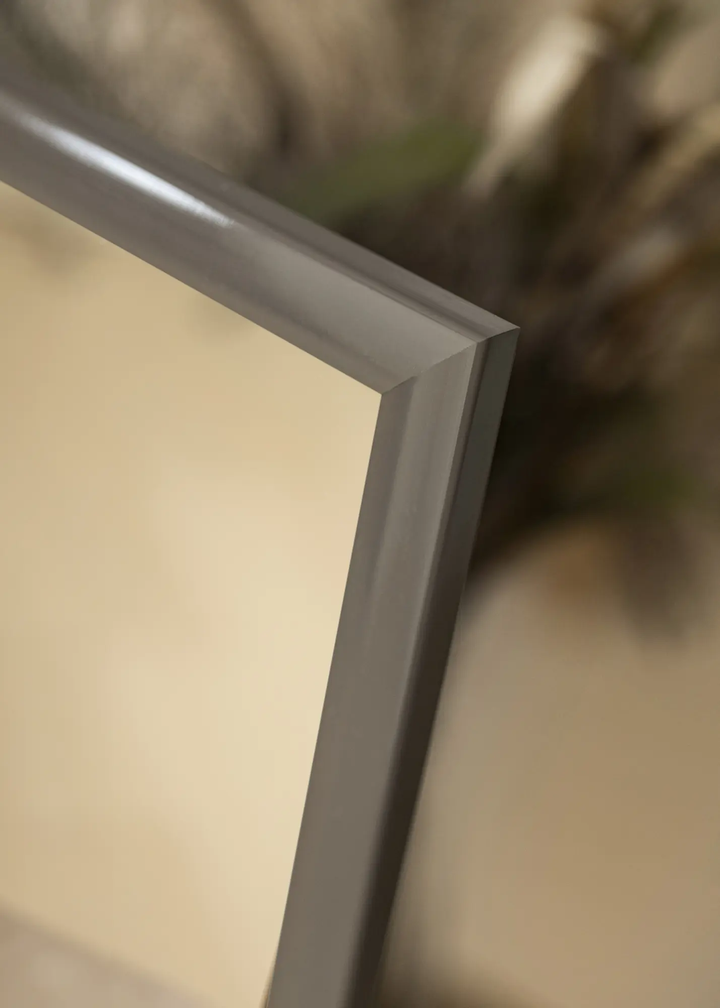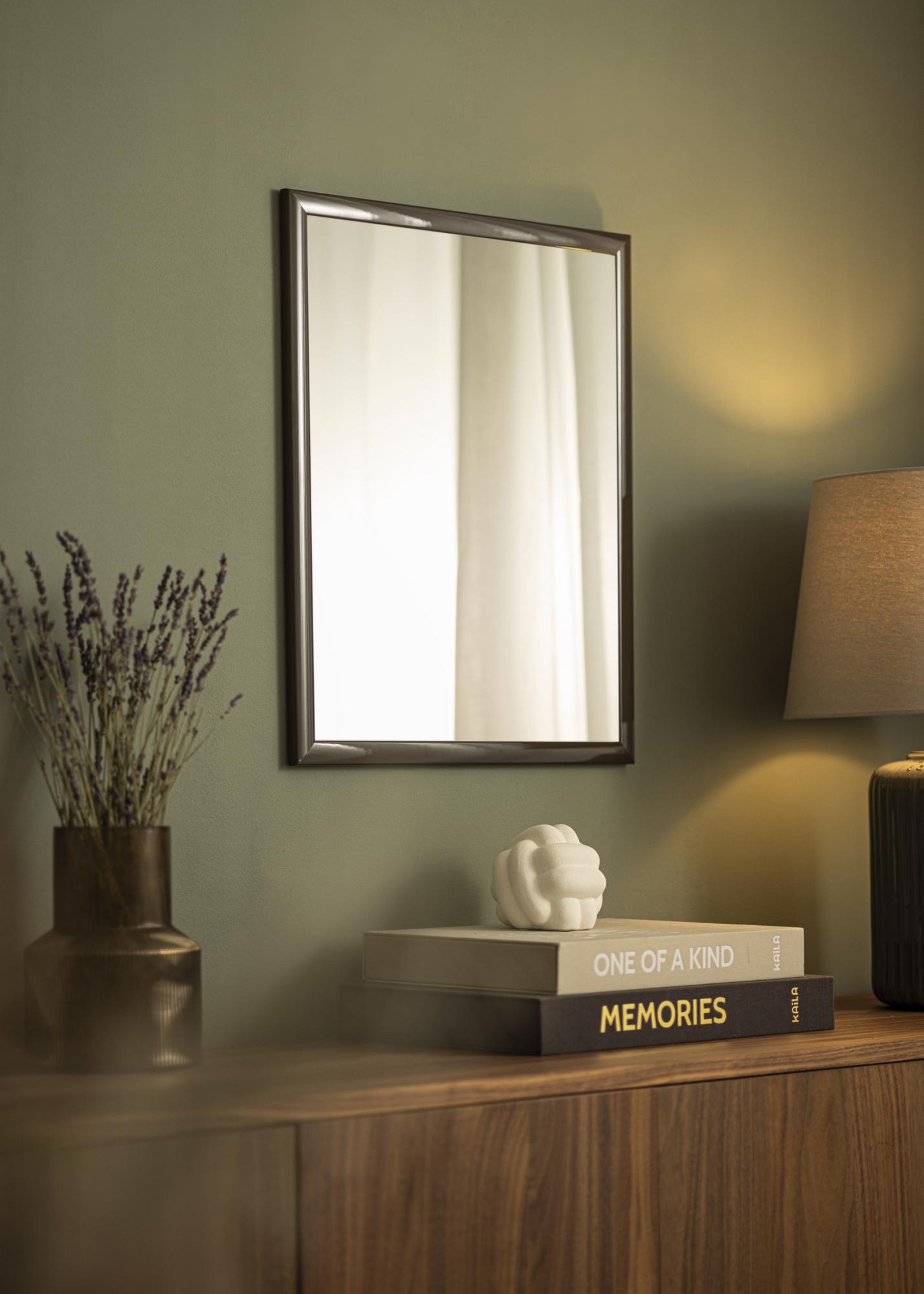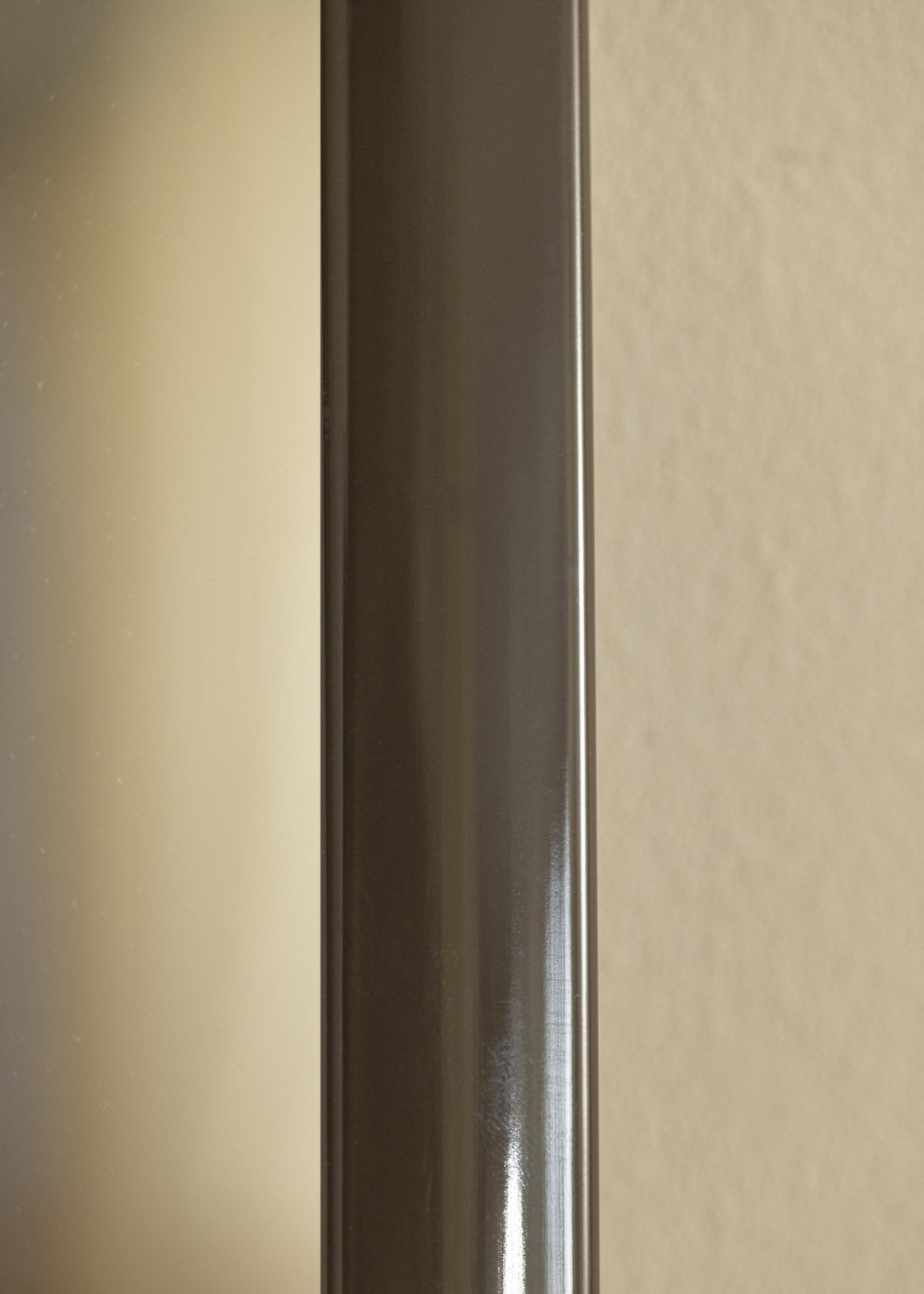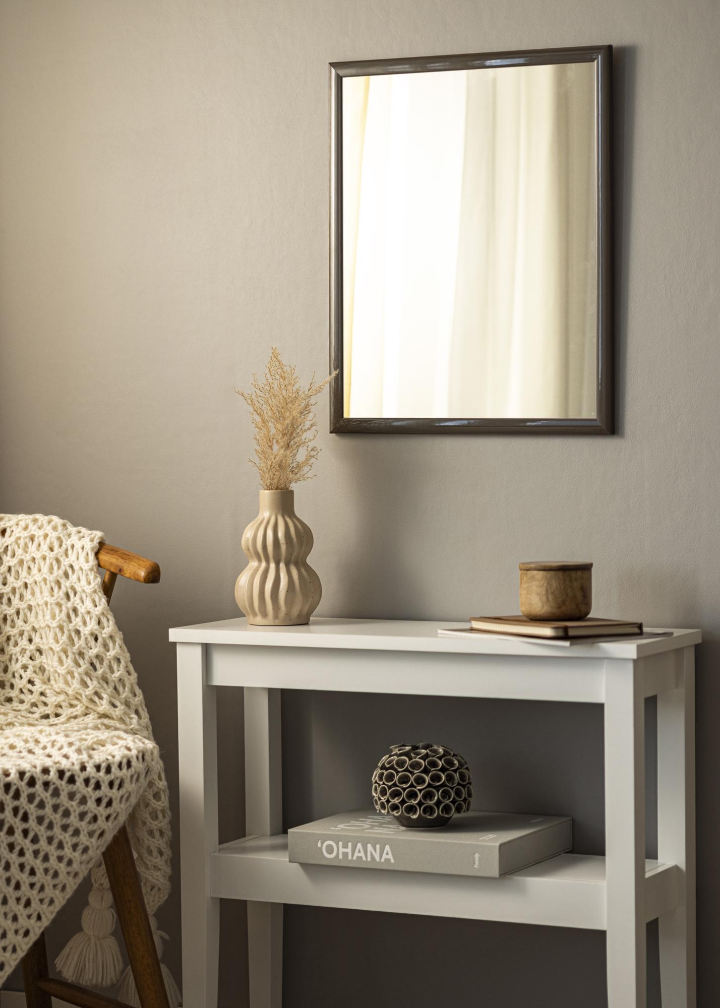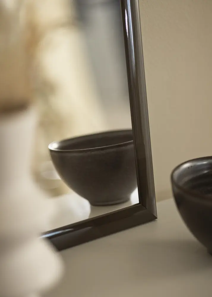 Рамката на огледалото е с ширина 23 мм и е изработена от айоссо дърво, което осигурява здрава и устойчива конструкция. С дълбочина от 13 мм, огледалото има дискретен профил, който се вписва в повечето среди без да доминира. Тъмносивият нюанс е едновременно модерен и вечен, което прави огледалото подходящо за различни интериорни стилове, от минималистични до по-традиционни.