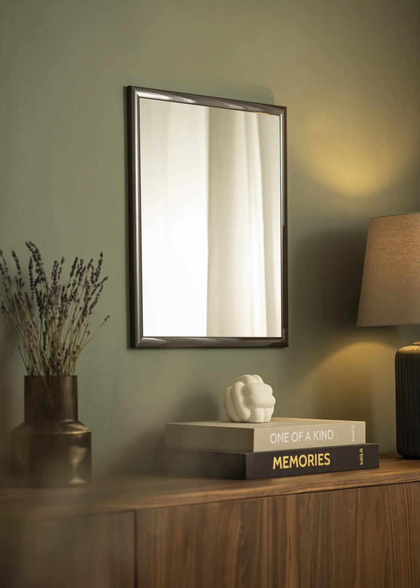 Със своя тъмносив цвят и високоблестящо покритие, Огледало Dorset предлага елегантна и отразяваща повърхност, която наистина привлича вниманието. Гладкото лаково покритие подсилва дълбочината на цвета и създава оживен израз, който придава на стаята усещане за изисканост. Блестящата повърхност улавя светлината по начин, който осигурява динамичен блясък в зависимост от ъгъла, което прави огледалото централна част от интериора.