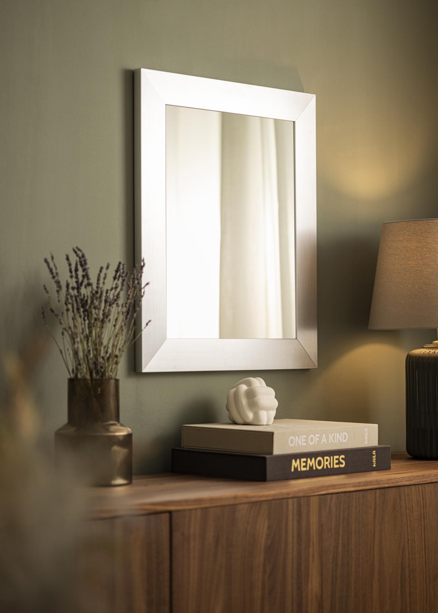 Огледало Довър Гладко Сребро е елегантно и стилно огледало, което произвеждаме с голяма грижа. Това огледало е перфектно за вас, ако търсите модерен интериорен елемент с нотка на лукс. Със своята широка рамка с четкана сребърна обработка, то придава софистициран вид и пасва отлично както в модерни, така и в класически среди.